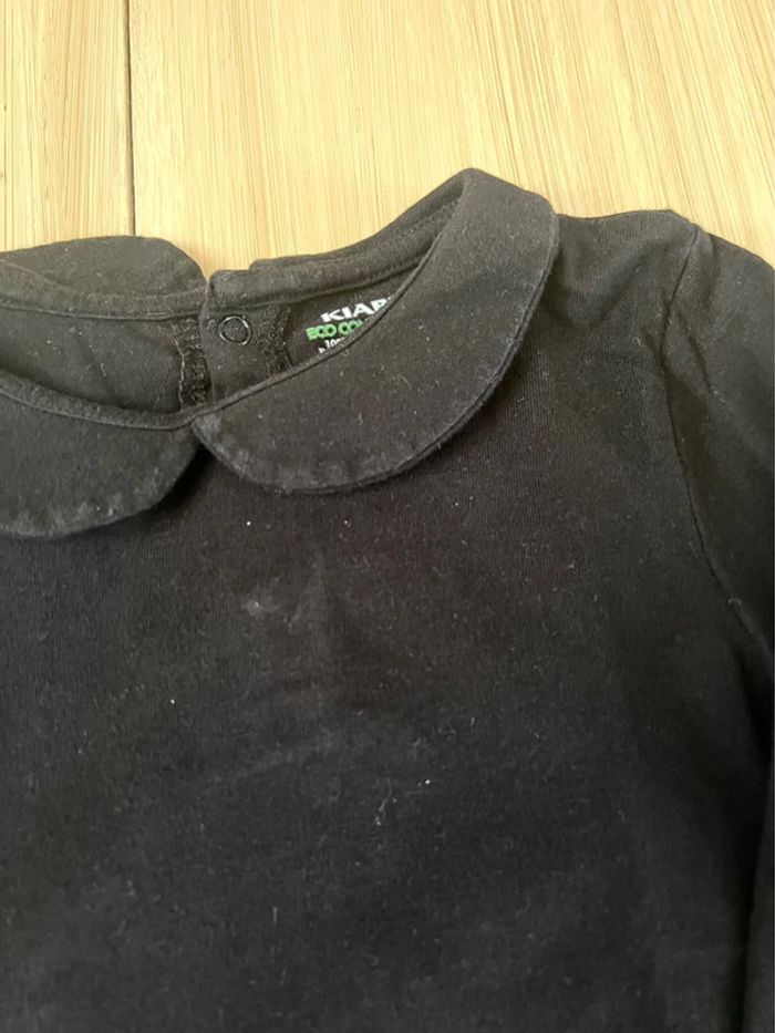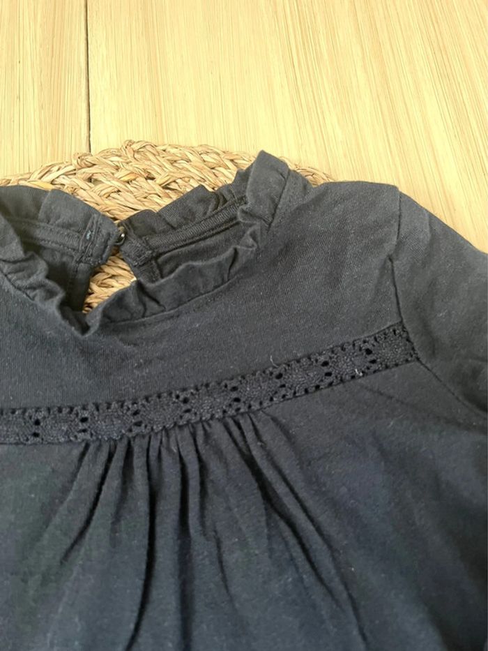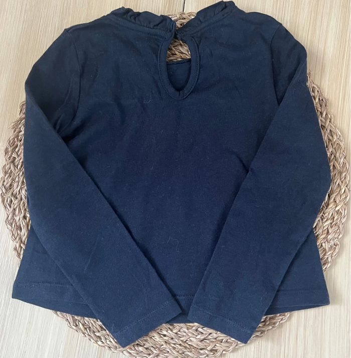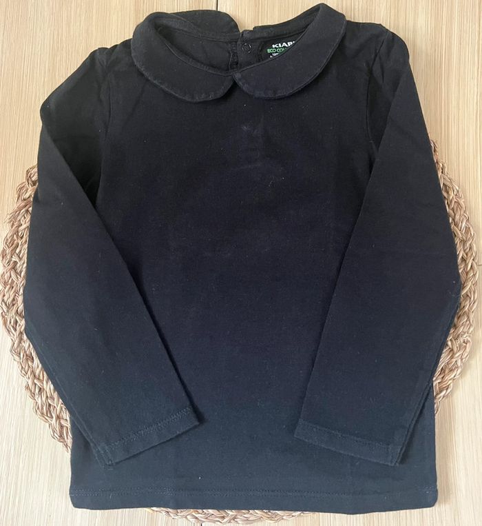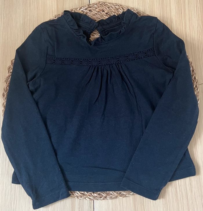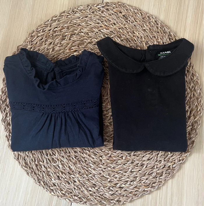 Lot de 2 tee-shirts manches longues de la marque Kiabi en bon état : -1 t-shirt en jersey avec dentelle devant, 100% coton, col volanté, coloris bleu marine, taille : 3 ans / 90-97 cm -1 t-shirt en jersey, petit col claudine, ouverture par 3 boutons pressions au dos, coloris noir, taille : 36 mois / 90-97 cm Valeur neuf du lot : 10,00€ Envoi rapide et soigné 📦
