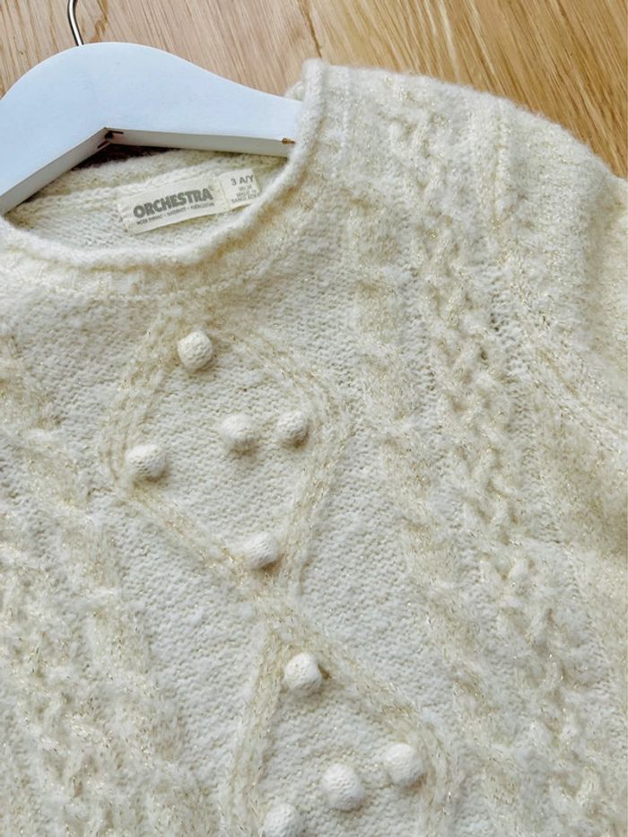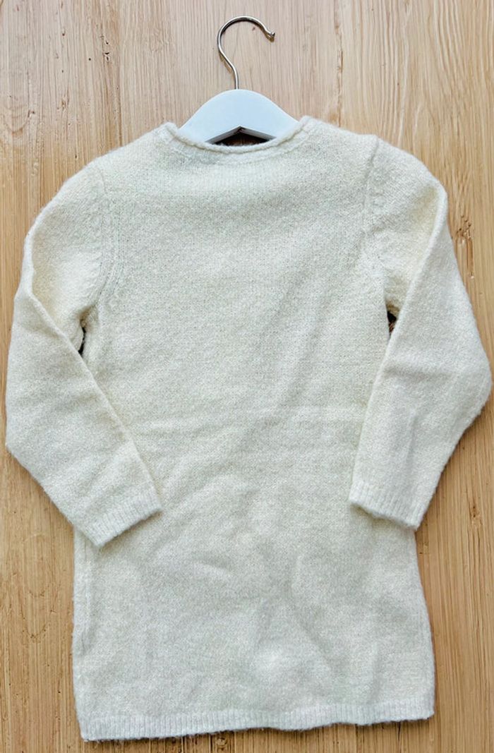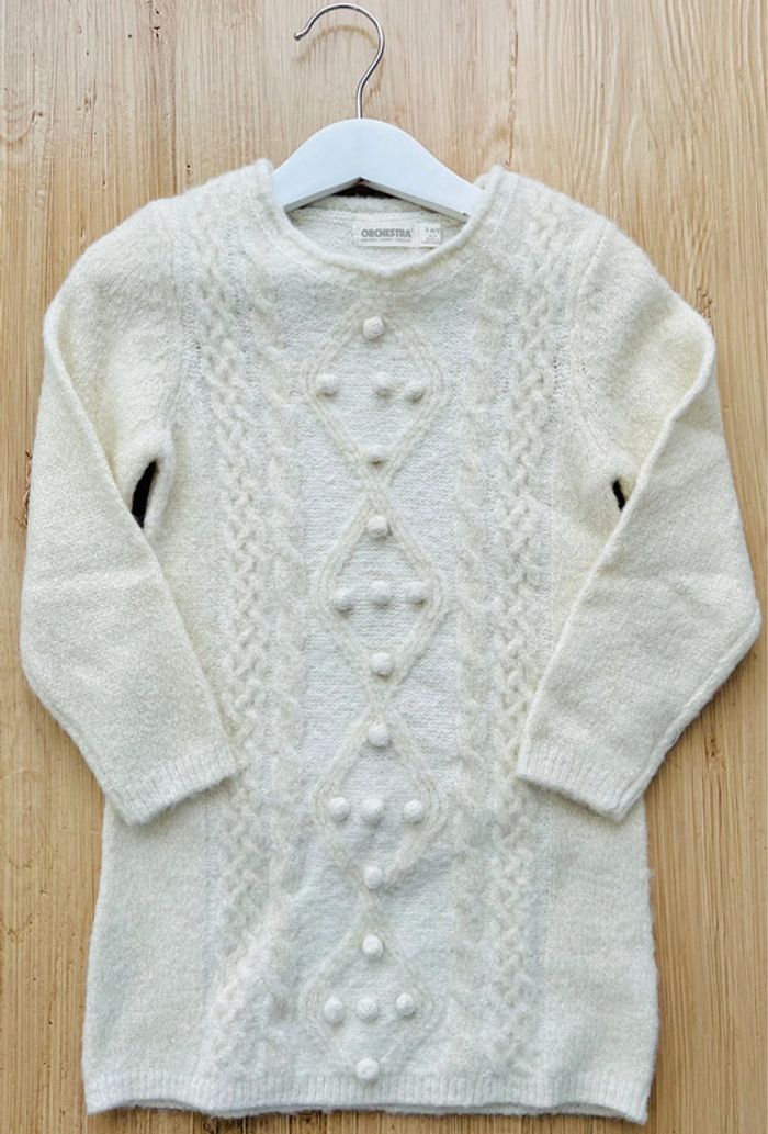 Robe en tricot de la marque Orchestra en très bon état. Robe pull en tricot, encolure ronde, pompons et torsades à l’avant, coloris écru et liserés dorés, taille : 3 ans / 98cm Valeur neuve : 29,99€ Envoi rapide et soigné 📦