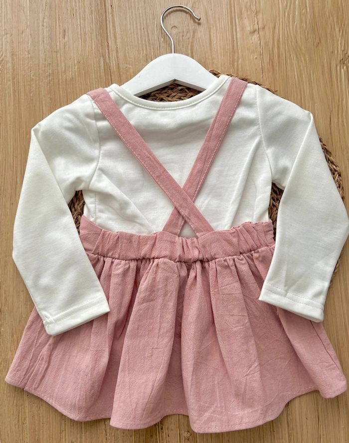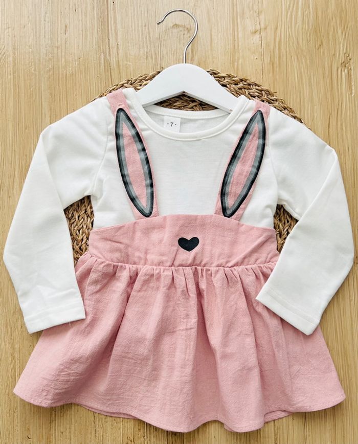 Robe lapin en très bon état. Ensemble cousu robe à bretelles et tee-shirt, jupe vieux rose avec bretelles et imprimé oreilles et nez cœur lapin, t-shirt écru et col rond, taille : 18-24mois. Envoi rapide et soigné 📦