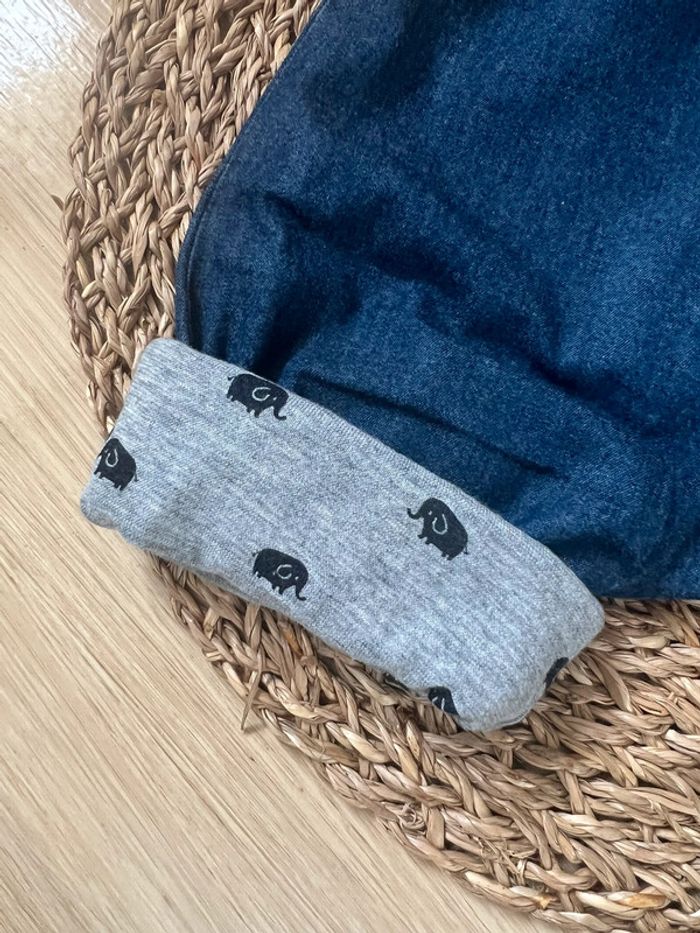 Pantalon denim de la marque Bout’Chou en bon état. Forme sarouel, entièrement doublé motifs petits éléphants, taille élastiquée, taille : 9 mois Valeur neuf : 19,99€ Envoi rapide et soigné 📦