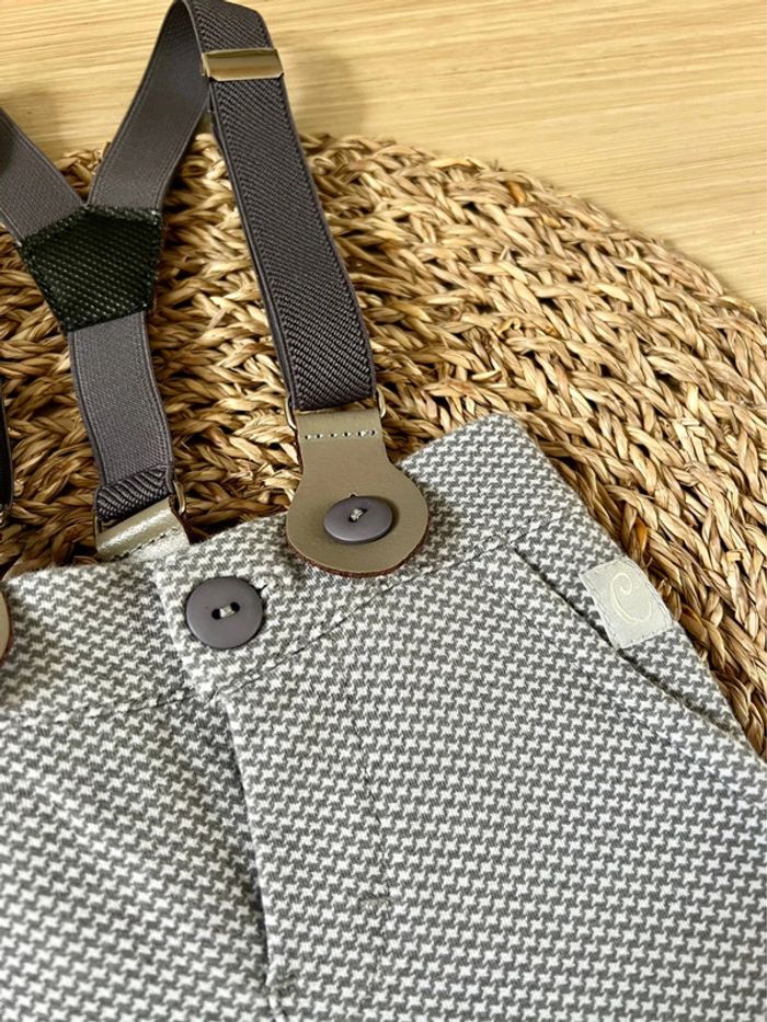 Pantalon à bretelles de la marque Patini neuf sans étiquette. Pantalon à pinces en coton élasthanne, coloris taupe et imprimé petites étoiles blanches, bretelles ajustables et amovibles, ouverture à bouton, 2 poches devant, taille élastiquée, taille : 62cm Valeur neuf : 19,99€ Envoi rapide et soigné 📦