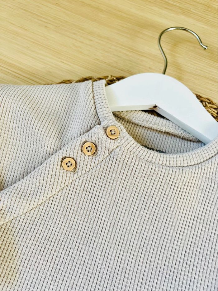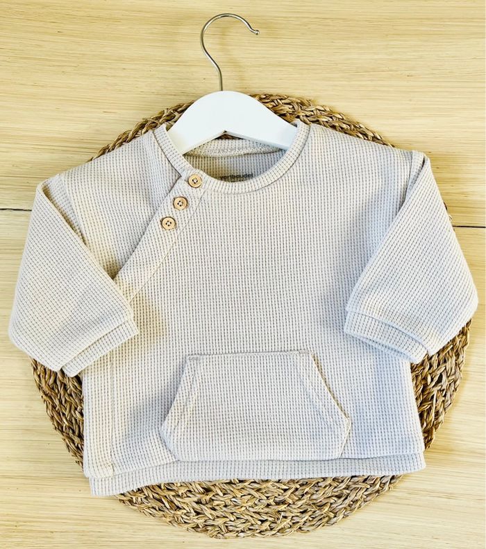 Ensemble sweat et pantalon de la marque Vertbaudet en très bon état : -Sweat en maille nid d’abeille beige, ouverture boutonnée devant sur toute la longueur, taille : 6 mois/67 cm -Pantalon 100% coton bleu ciel, coupe sarouel, taille élastiquée avec liens à la taille, 2 poches devant, taille : 6 mois/67 cm Valeur neuf de l’ensemble : 25,98€ Envoi rapide et soigné 📦