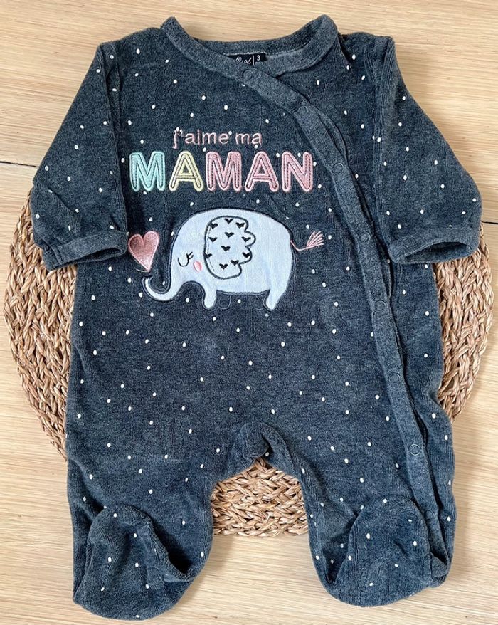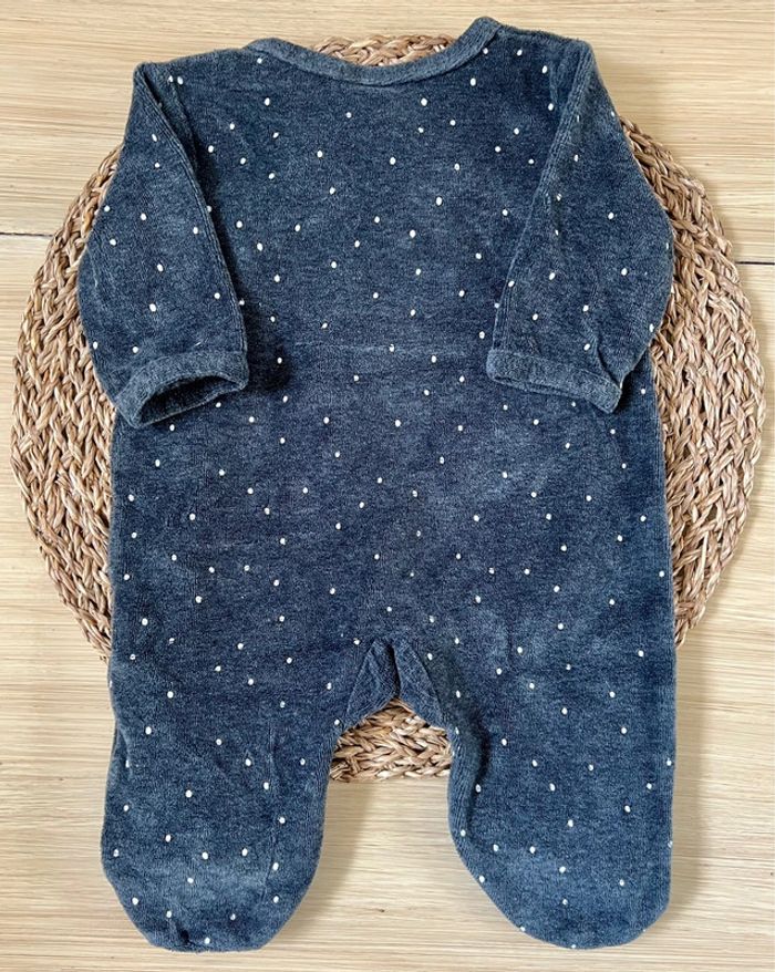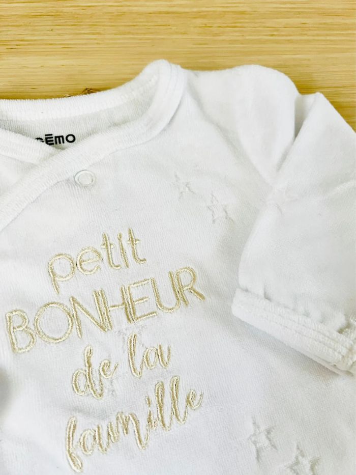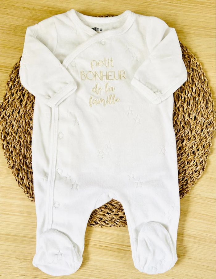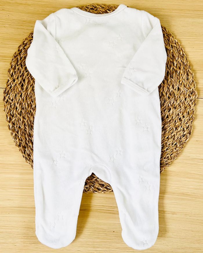 Lot de 2 pyjamas dors-bien en très bon état : -1 pyjama en velours de la marque Gémo, blanc parsemé d’étoiles et broderie dorée à l’avant, ouverture par pressions à l’avant du col jusqu’au pied, taille : 3 mois -1 pyjama en velours de la marque Influx, gris anthracite et broderie à l’avant, ouverture par pressions à l’avant du col jusqu’au pied, taille : 3 mois Valeur neuf du lot : 21,99€ Envoi rapide et soigné 📦