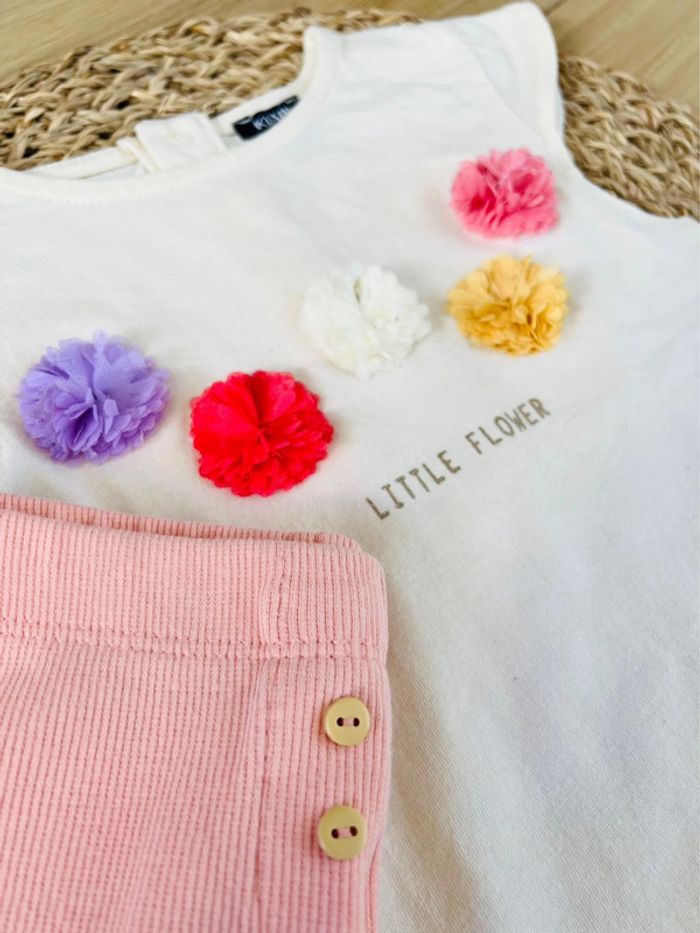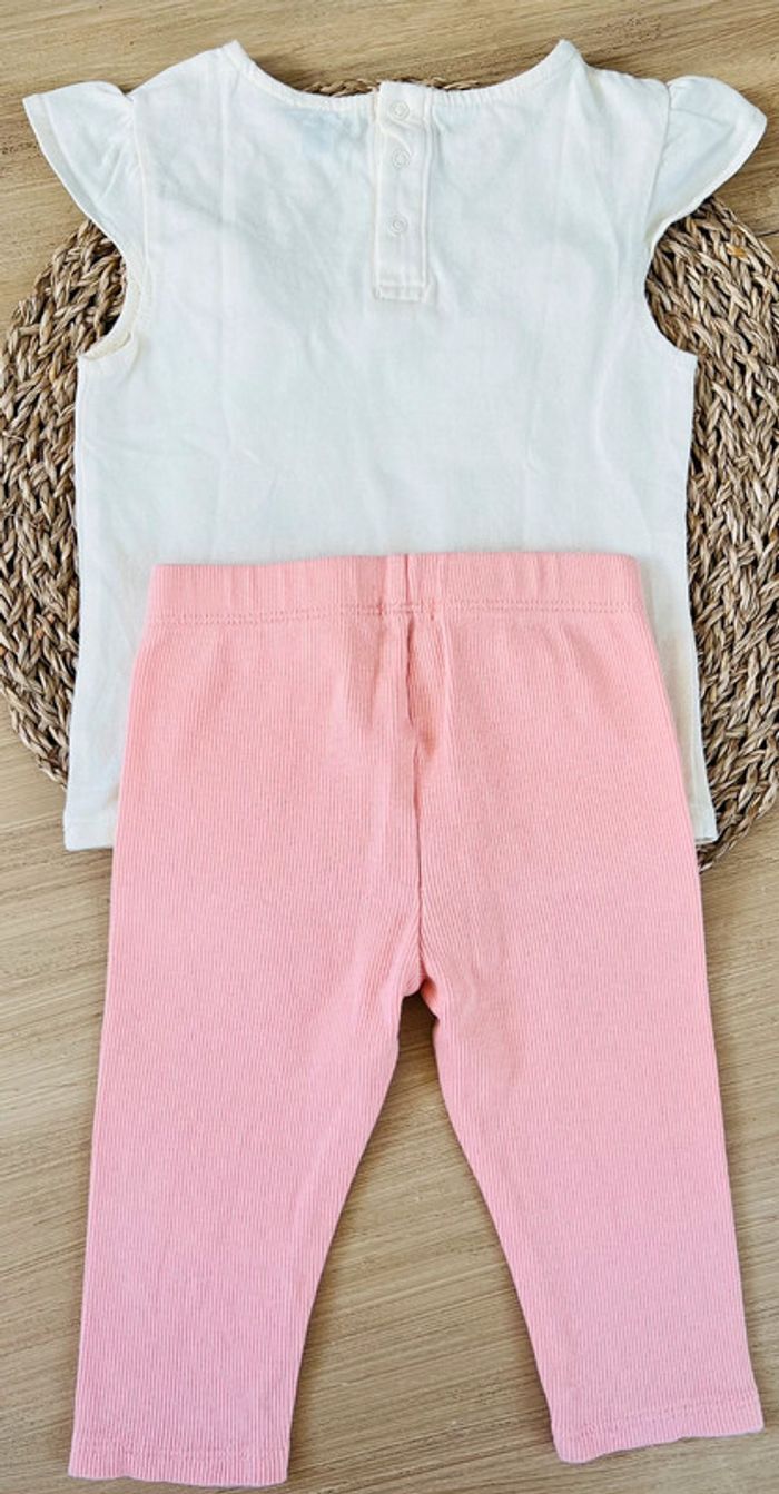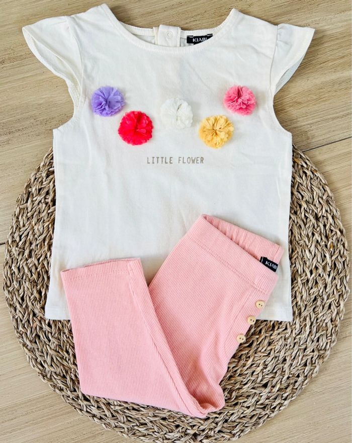 Ensemble 2 pièces de la marque Kiabi en très bon état. T-shirt avec manches papillon, boutons pressions au dos, coloris beige avec petits fleurs en relief. Legging rose en maille côtelée, taille élastiquée et 3 boutons fantaisie sur le devant. Taille : 18 mois (77-82cm / 11kg) Envoi rapide et soigné 📦