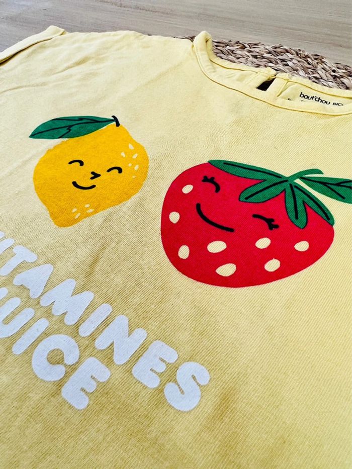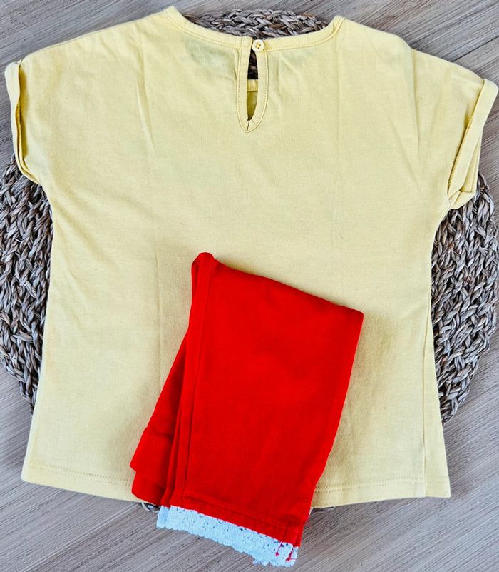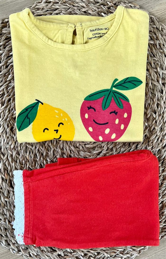Ensemble 2 pièces composé de : 1 tee-shirt jaune clair, imprimé fruits, bouton col au dos de la marque Bout’chou Bio en bon état. 1 legging 3/4 rouge de la marque Orchestra en état satisfaisant. Taille : 24 mois Envoi rapide et soigné 📦
