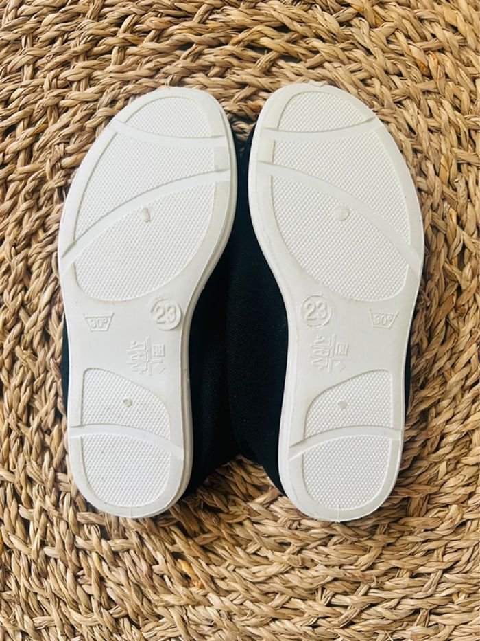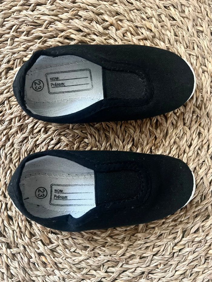 Ballerines/chaussons de danse en toile neufs sans étiquette. Chaussons de gymnastique en toile souples et élastiqués, coloris noir, semelle élastomère blanche, pointure : 23