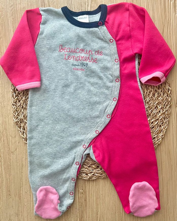 Pyjama dors-bien de la marque Absorba en très bon état. Pyjama en coton, coloris rose fuchsia et gris chiné, poignets et pieds contrastés rose clair, message imprimé à l’avant, ouverture côté pressionée sur l’intégralité de l’avant, taille : 9mois/71cm Valeur neuf : 24,90€ Envoi rapide et soigné