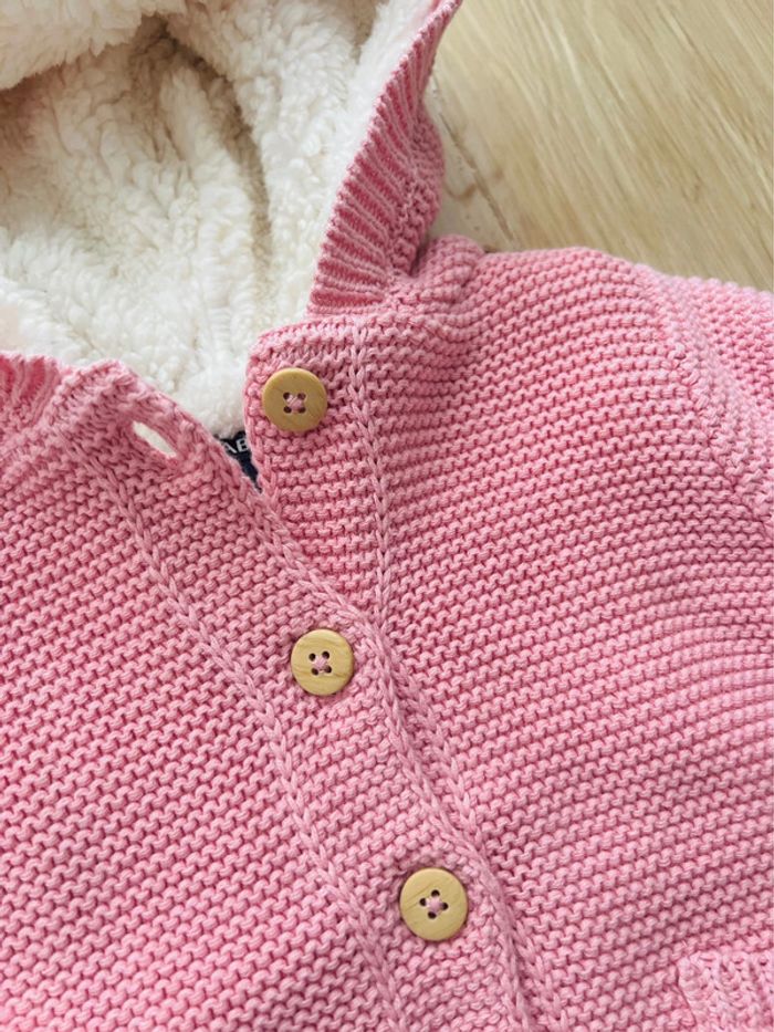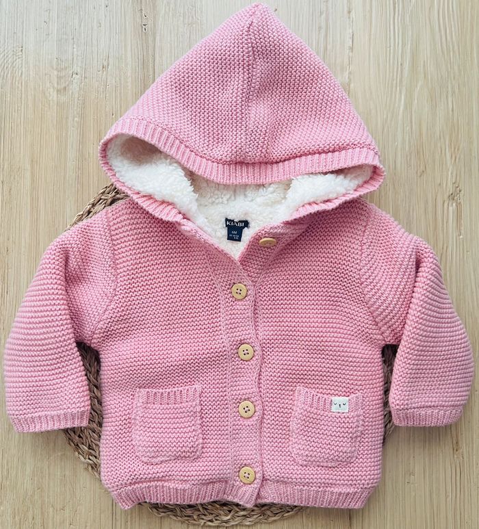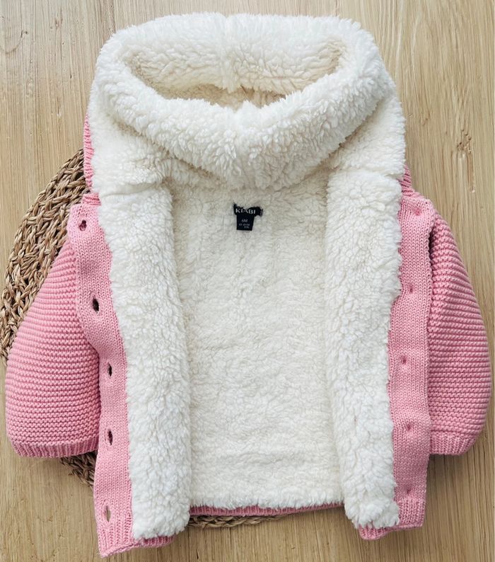 Gilet/veste en tricot de la marque Kiabi en très bon état. Gilet manteau en maille tricot avec capuche et doublure intérieure sherpa, doux et chaud, ouverture par boutons à l’avant, poignets finition bords-côtes, 2 poches avant, taille : 6mois/63-69cm/8kg Valeur neuf : 22,00€ Envoi rapide et soigné 📦