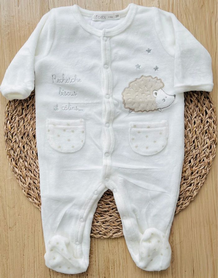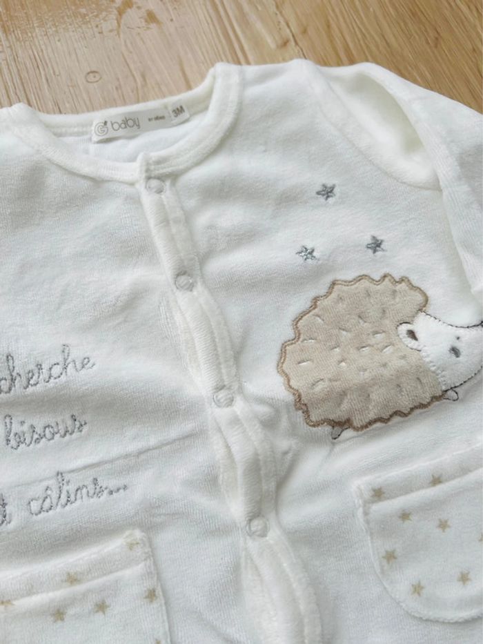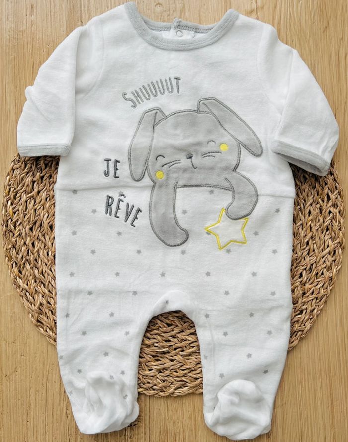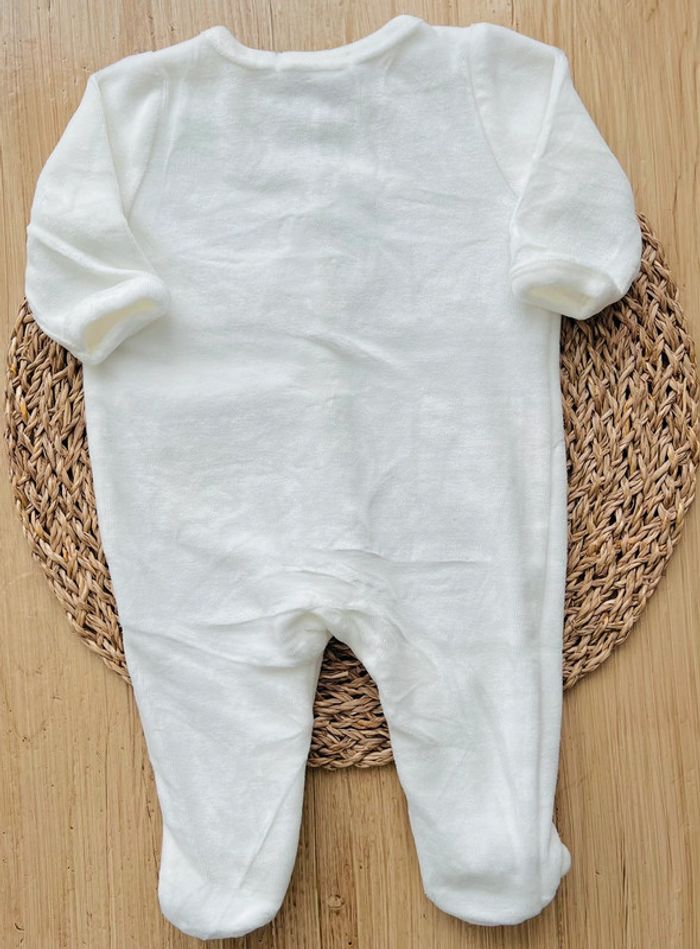 Lot de 2 pyjamas dors-bien mixtes de la marque Gémo neufs sans étiquette (jamais portés) : -1 pyjama en velours, coloris blanc avec petits motifs étoiles et grande broderie lapin sur le devant, col rond, finition biais contrastant aux poignets et au col, fermeture pont-dos pressionnée, taille : 3 mois/59cm -1 pyjama en velours, coloris écru avec broderie argentée et hérisson , deux fausses poches sur l’avant, semelles à motif étoilée, petites oreilles en relief sur les pieds, ouverture ventrale intégrale par boutons pression, taille : 3 mois Valeur neuf du lot : 19,98€ Envoi rapide et soigné 📦