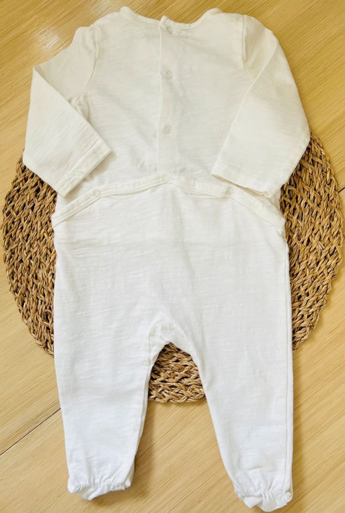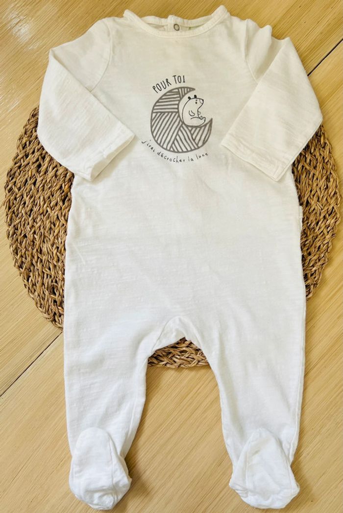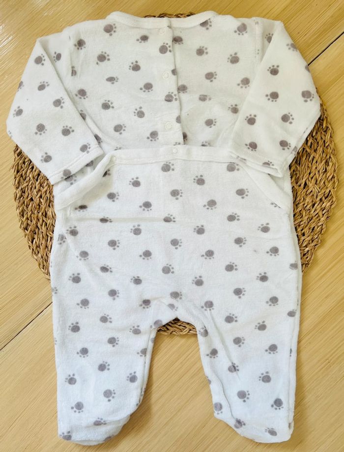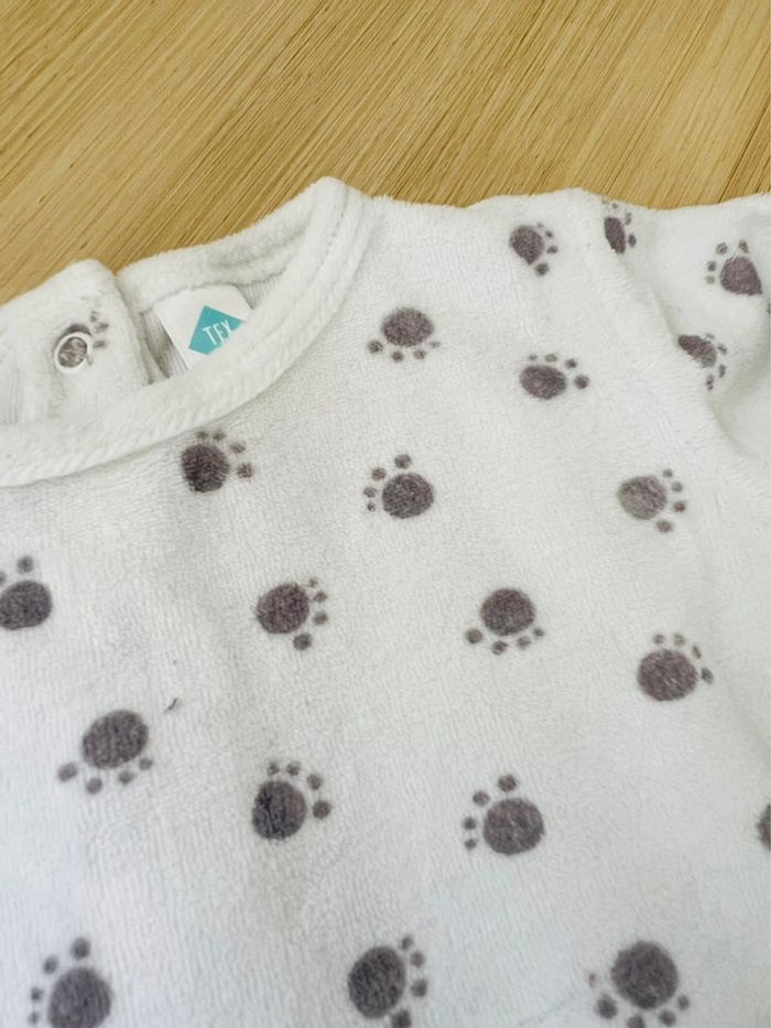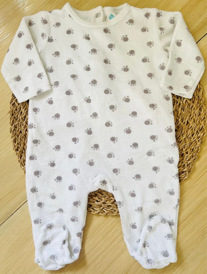 Lot 2 pyjamas dors-bien en très bon état : -1 pyjama en velours avec pieds de la marque TEX baby, ouverture par boutons pressions au dos, coloris blanc avec imprimé empreintes grises, taille : 6 mois -1 pyjama en coton avec pieds de la marque Tape à l’Oeil, ouverture par boutons pressions au dos, coloris écru avec imprimé en relief à l’avant, taille : 6 mois/68cm Valeur neuf du lot : 24,00€ Envoi rapide et soigné 📦