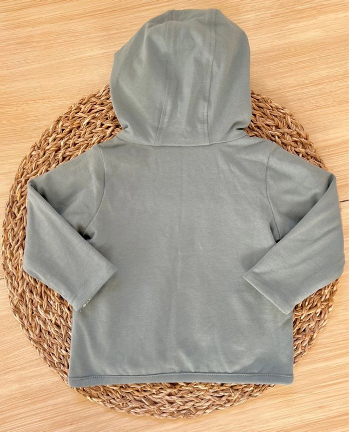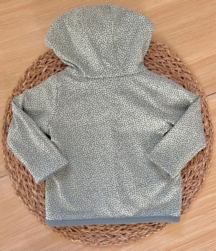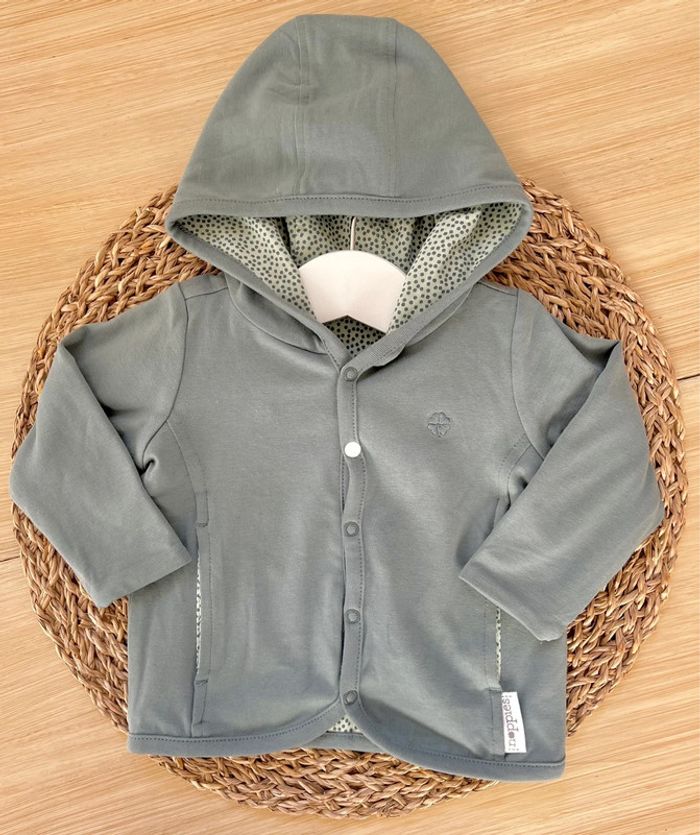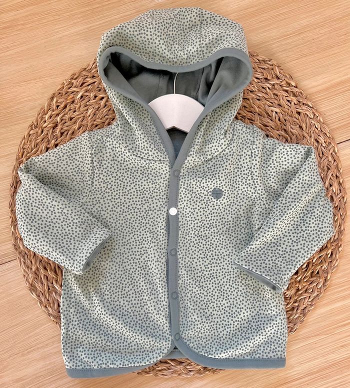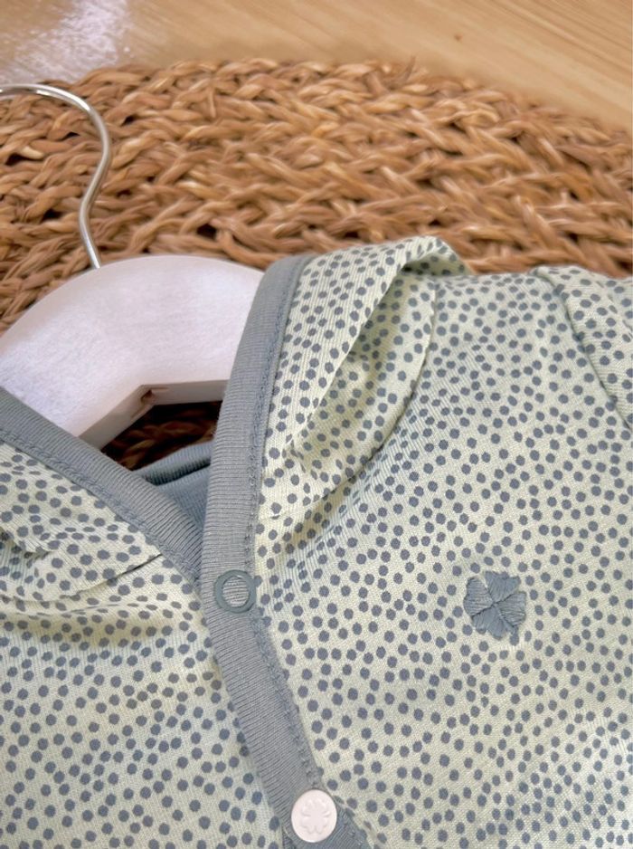 Ensemble unisexe pantalon et veste réversible de la marque Noppies neuf avec étiquette : -Cardigan/gilet à capuche entièrement réversible avec une face unie grey mint ou une face imprimée pois all-over, 2 poches, fermeture par boutons pressions, en coton biologique et stretch -Pantalon assorti imprimé en coton biologique avec stretch, grande taille élastique avec cordon de serrage, ourlets pliés possible avec revers contrastés Taille : 2-4 mois / 62cm Valeur neuf : 39,98€ Envoi rapide et soigné 📦
