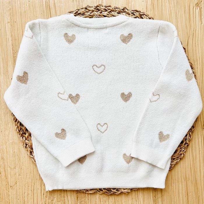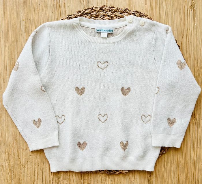 Pull jacquard de la marque Vertbaudet en très bon état. Pull en tricot écru avec motifs coeurs en jacquard et en fils irisés, ouverture boutonnée épaule, finition bord en côtes douce, taille : 18 mois/81 cm Valeur neuf : 19,99€ Envoi rapide et soigné 📦