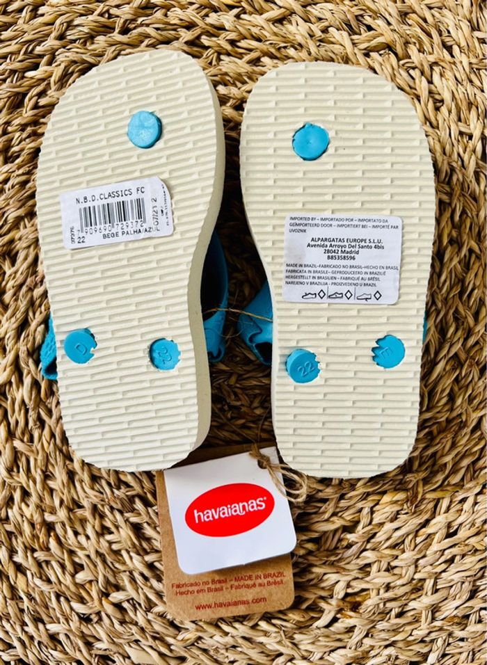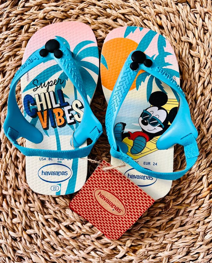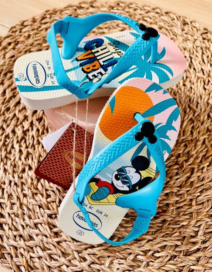 Tongs premiers pas bébé de la marque Havaianas neuves avec étiquette. Modèle Mickey Baby Disney Classics, ultra légères avec sangle de maintien élastiquée à l’arrière, pointure : 22 (USA 8C / EUR 24). Valeur neuves : 23€ Envoi rapide et soigné 📦