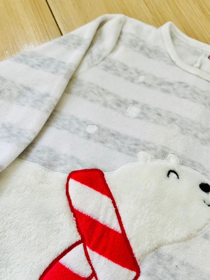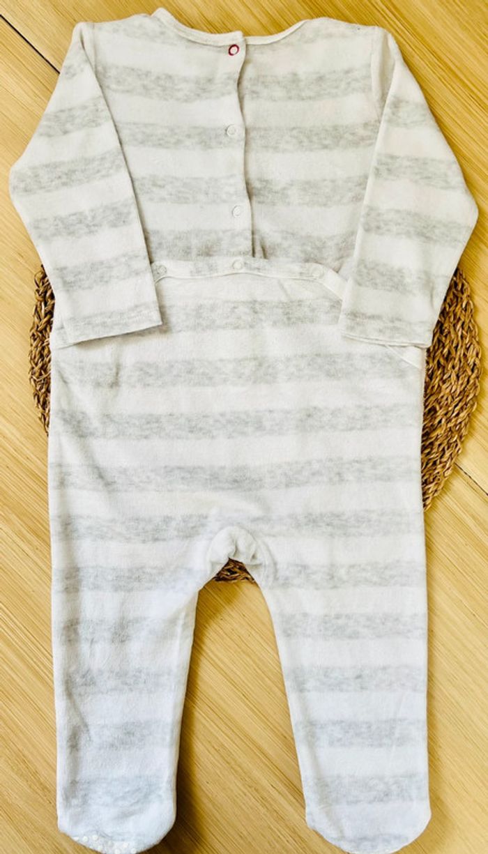 Pyjama dors bien unisexe de la marque Tex baby en très bon état. Pyjama dors-bien avec pieds antidérapants, en velours, col rond, manches longues, ouverture par boutons pressions au dos, coloris blanc rayé gris clair avec broderie en relief ours polaire, taille : 18mois Envoi rapide et soigné 📦