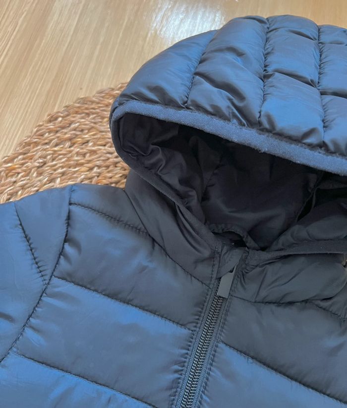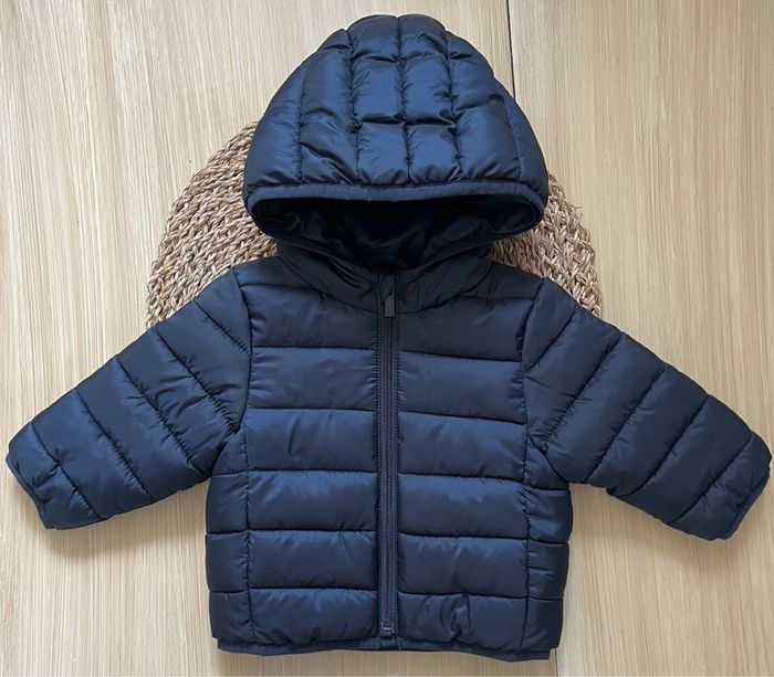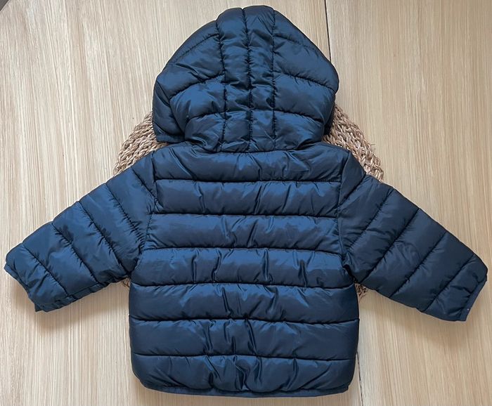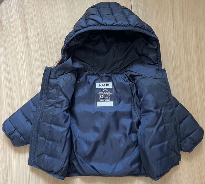 Doudoune matelassée de la marque Kiabi en très bon état. Doudoune matelassée à capuche, légère avec 100% de polyester recyclé, déperlante, ouverture par zip avec protège menton, boucle accroche porte manteau, étiquette prénom intérieure, coloris bleu marine, taille : 12 mois/73-76cm/10kg. Valeur neuve : 12€ Envoi rapide et soigné 📦