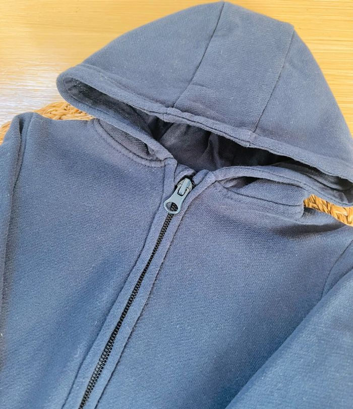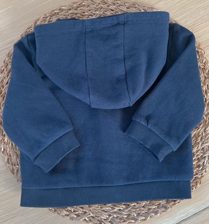 Sweat à capuche zippé de la marque Kiabi en très bon état. Gilet zippé avec capuche, intérieur molleton gratté doux et chaud, ouverture zippée devant avec protège menton, finition bord-côtes, coloris bleu marine, taille : 12mois/73-76cm/10kg. Valeur neuf : 9€ Envoi rapide et soigné 📦