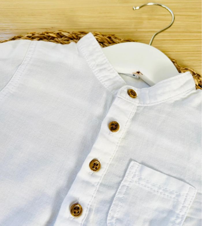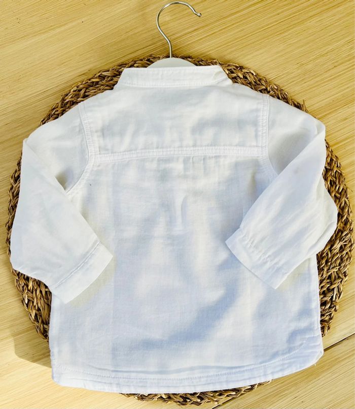 Chemise col tunisien de la marque Kiabi en très bon état. Chemise 100% coton bio, col tunisien, manches longues avec poignets boutonnés et attaches pour manches en 3/4, ouverture par boutons au col, poche poitrine, fentes à la base sur les côtés, coloris blanc, taille : 9mois/71cm/9kg. Valeur neuve : 9€ Envoi rapide et soigné 📦