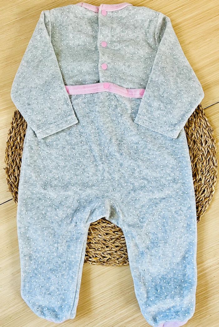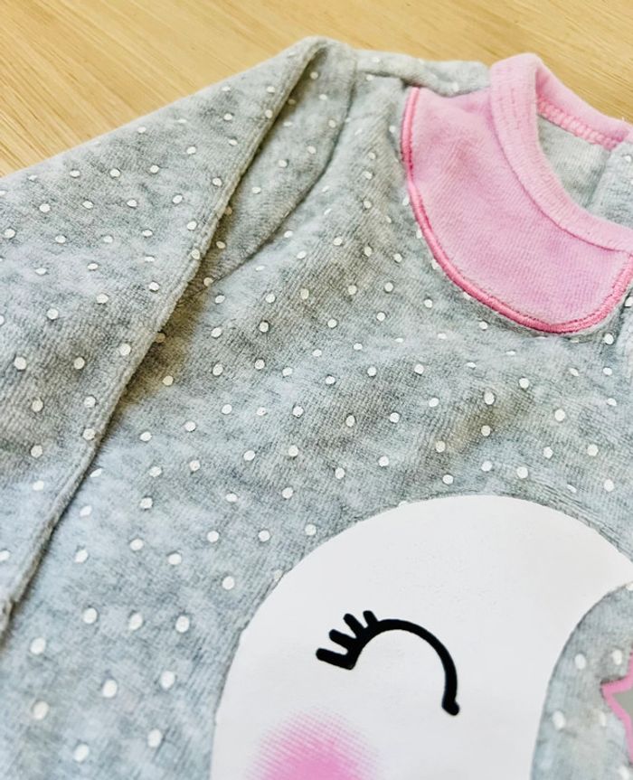 Pyjama dors-bien de la marque Tissaia en très bon état. Pyjama en velours, ouverture par boutons pressions au dos, coloris gris chiné avec col et pieds contrastés rose clair et imprimé lune et étoiles à l’avant, taille : 9 mois. Envoi rapide et soigné 📦