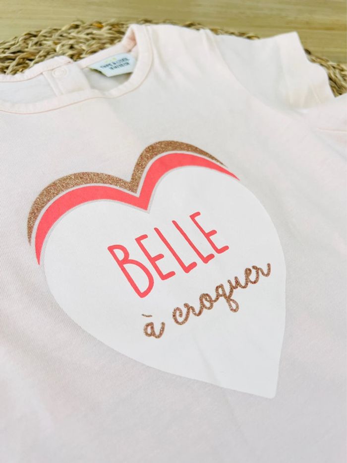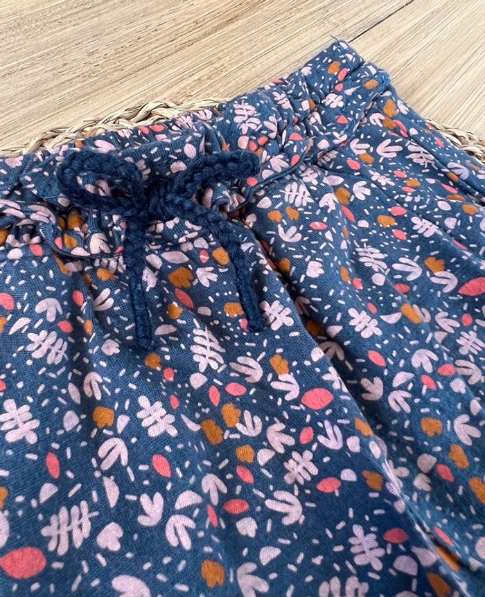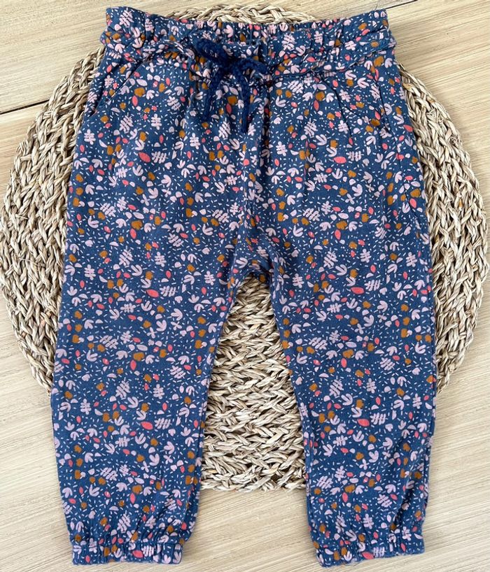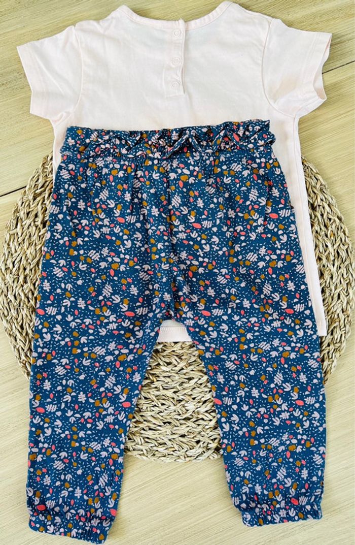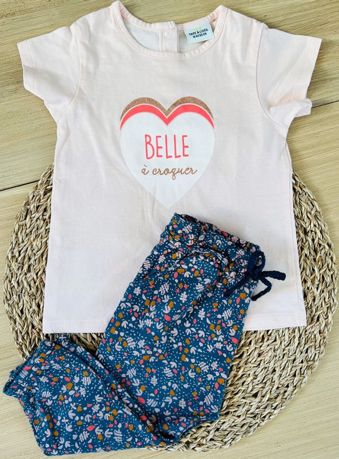 Ensemble 2 pièces : pantalon fluide type sarouel de la marque Vertbaudet et t-shirt de la marque TAO en très bon état. Pantalon fluide et léger avec taille élastiquée et noeud décoratif, 2 poches avant, coloris bleu/gris et imprimé fleuri, taille 18 mois (81cm). T-shirt avec ouverture par boutons pressions au dos, coloris rose pastel et logo imprimé coeur, taille 18 mois (80cm).