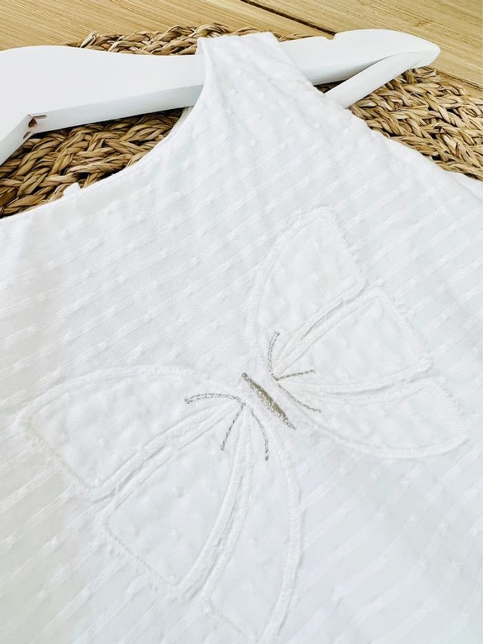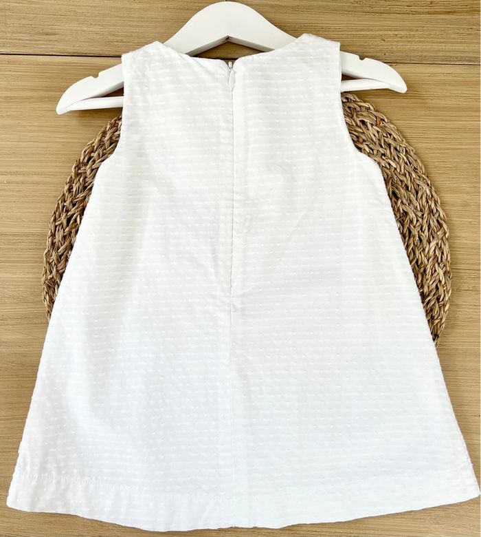 Robe de la marque Obaïbi en très bon état. Idéale pour cérémonie, entièrement doublée, broderie rayures et papillon, ouverture par fermeture éclair au dos. Taille : 18 mois (80cm)