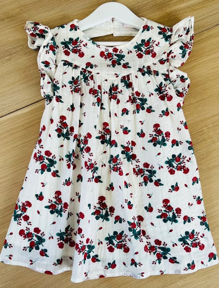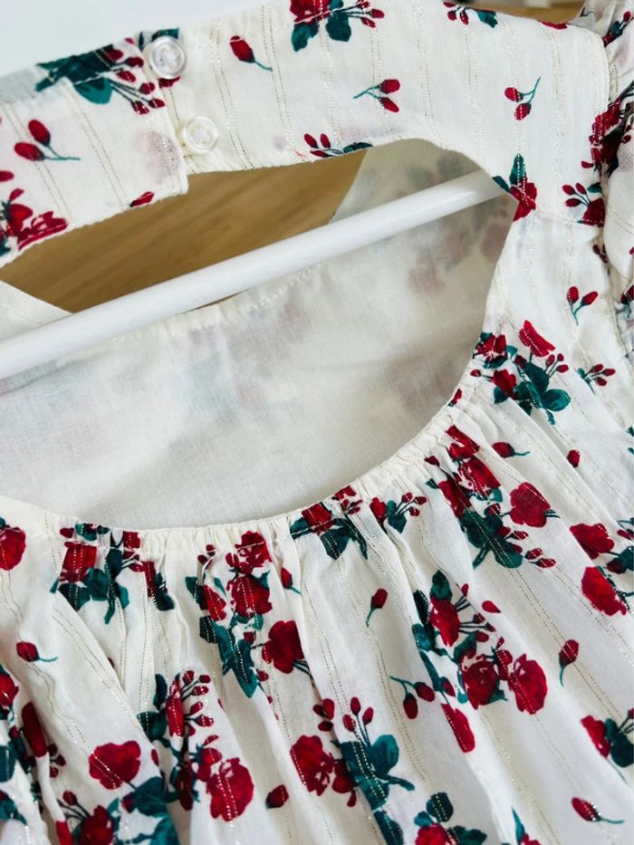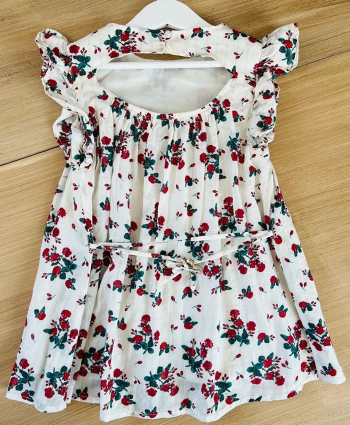 Robe fleurie de la marque TAO en parfait état (portée une fois). Doublure intégrée, fines lignes de fil doré, manches courtes à volants, et ceinture à nouer. Taille : 3 ans Valeur neuve : 21,99€