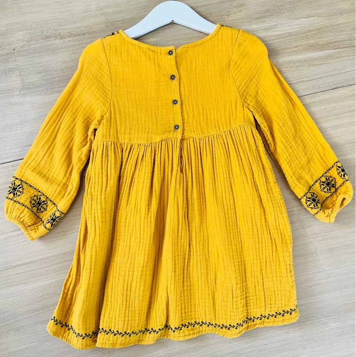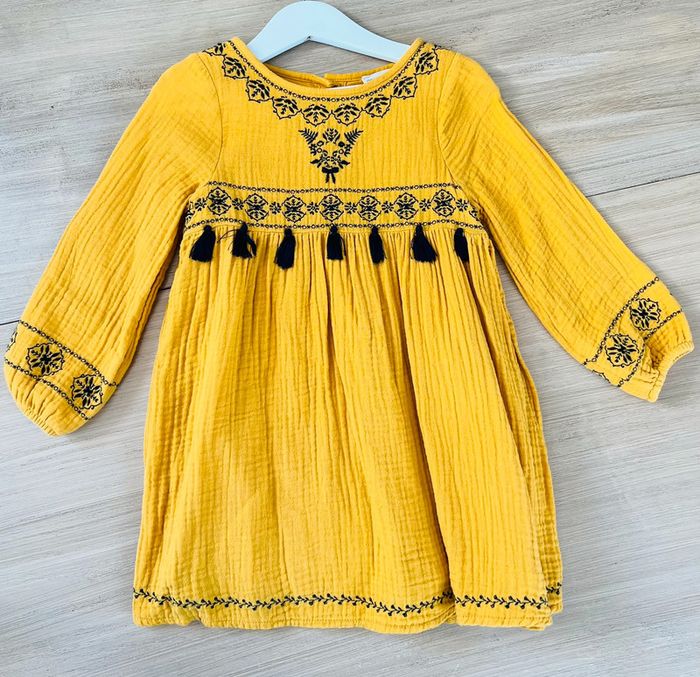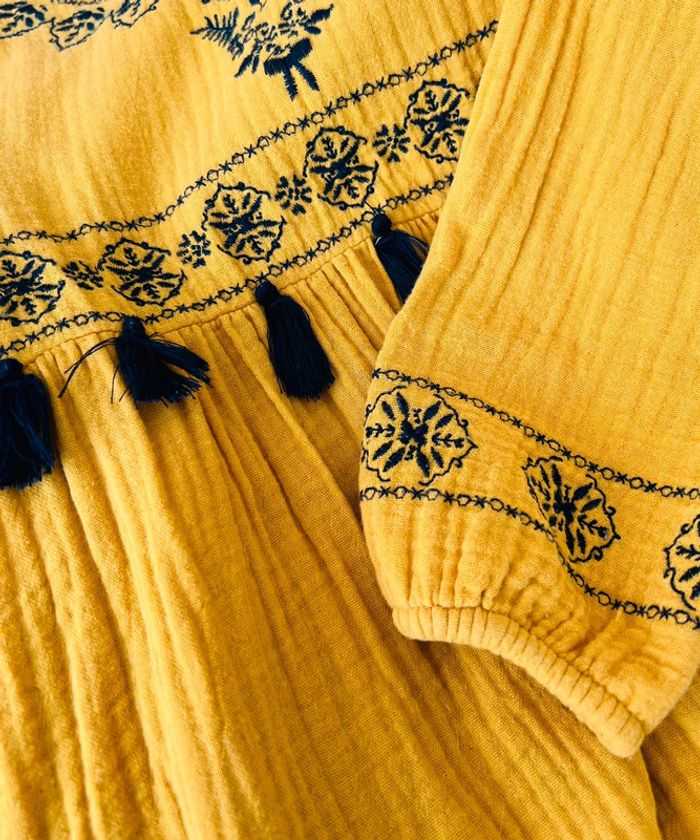 Robe en gaz de coton de la marque Orchestra en très bon état. Coupe ample, doublure intégrée, manches longues et bouffantes, broderie style ethnique et pompons sur le devant. Coloris : jaune moutarde, taille : 3 ans Valeur neuve : 41,99€