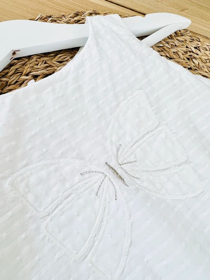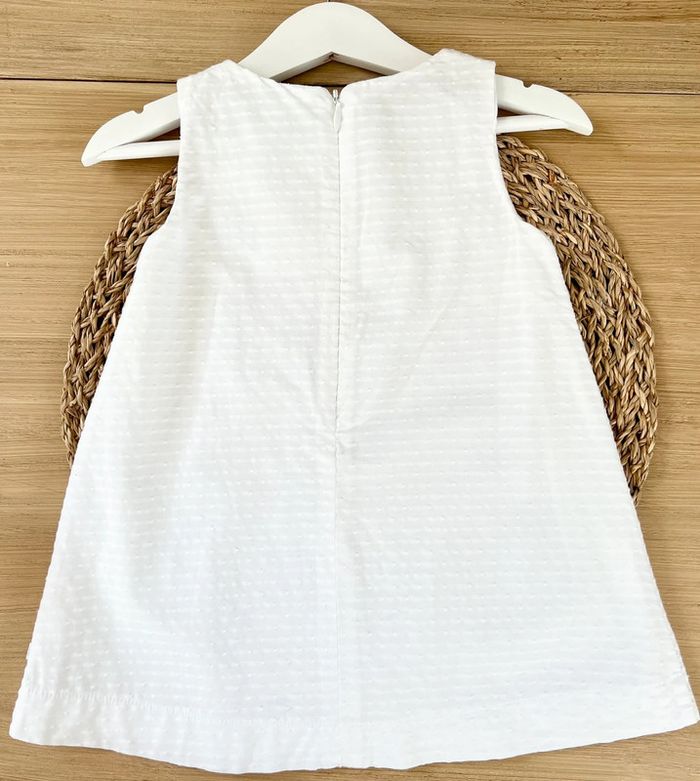 Robe de la marque Obaïbi en très bon état. Idéale pour cérémonie, entièrement doublée, broderie rayures et papillon, ouverture par fermeture éclair au dos. Taille : 18 mois (80cm) Envoi rapide et soigné 📦