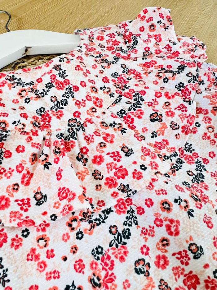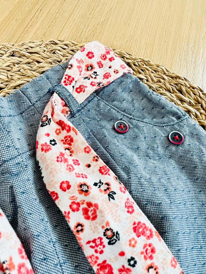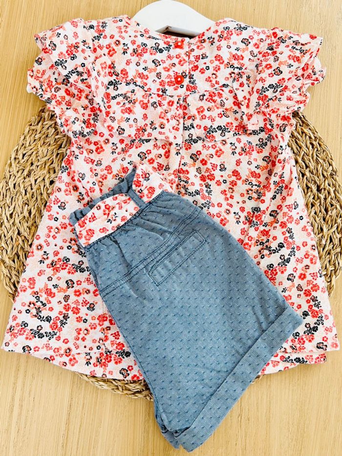 Ensemble 2 pièces blouse + short de la marque Orchestra en très bon état. Blouse imprimée fleuri, volant, ouverture 2 boutons au dos. Short coloris denim, taille élastiquée, ceinture imprimée fleuri, 2 poches avant. Taille : 18 mois (81cm) Envoi rapide et soigné 📦