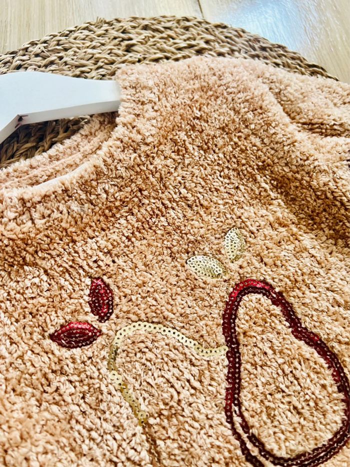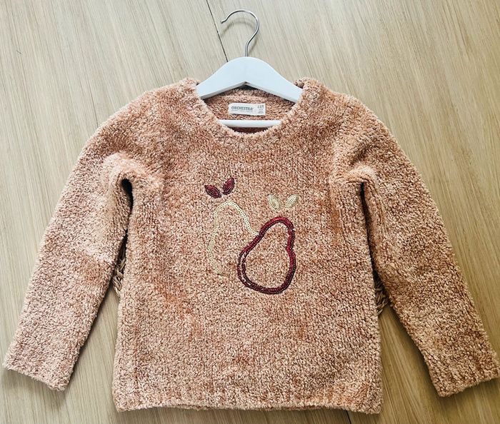 Pull chenille très doux de la marque Orchestra en très bon état. Col en maille extensible pour faciliter le passage de la tête, motifs poires en sequins magiques sur le devant, poignets et base en maille extensible, taille : 4 ans / 104 cm. Valeur neuf : 25,99€ Envoi rapide et soigné 📦