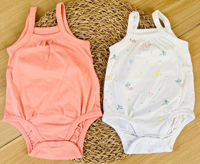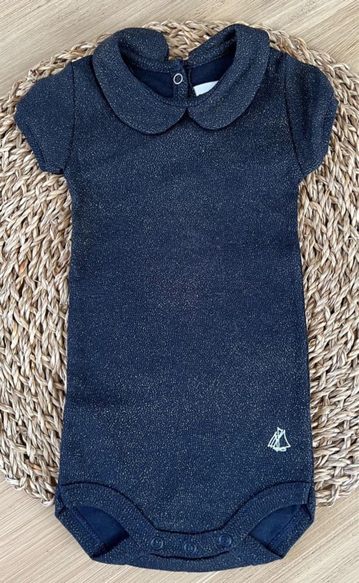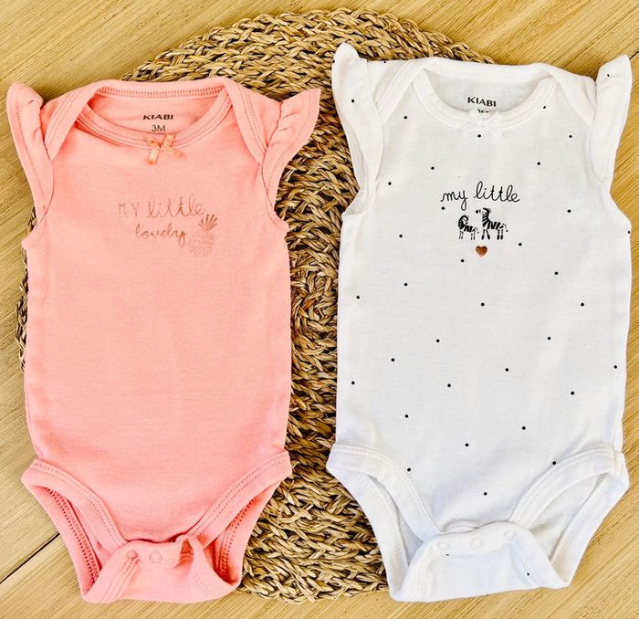 Lot de 5 bodies en très bon état et composé de : -1 body bleu marine pailleté or, coton stretch, boutons pressions au dos, de la marque Petit Bateau -2 bodies petites manches papillon, encolures américaines, de la marque Kiabi -2 bodies à fines bretelles, coton stretch, de la marque Kiabi Taille : 3 mois