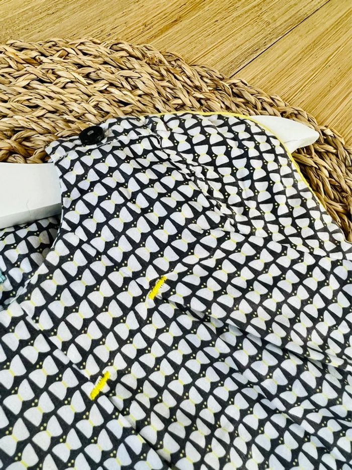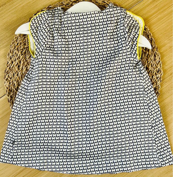 Robe de la marque Obaïbi en très bon état. Légère, ouverture par boutons sur les manches, coloris : fond gris, imprimé petite papillons blancs et jaunes, surpiqûres jaunes. Taille : 9 mois (71cm)