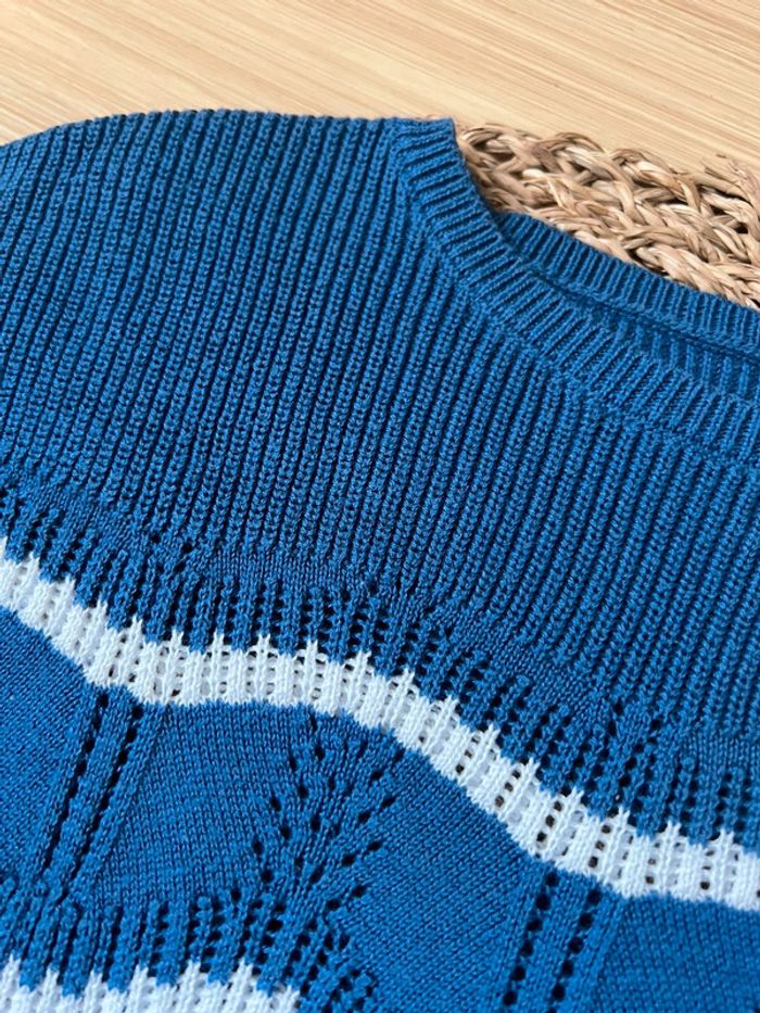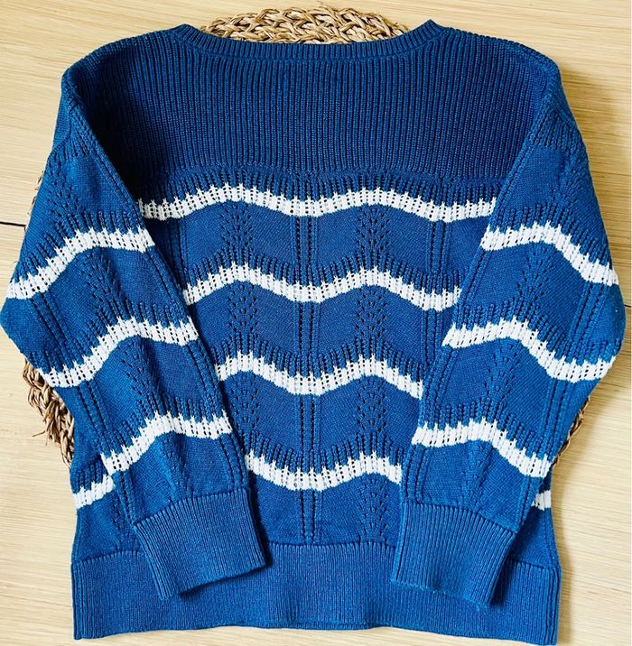 Pull en maille ajourée de la marque LuluCastagnette en bon état. Pull marin tricoté en maille ajourée, jeu de côtes sur le haut du buste et maille fantaisie dans le bas, coloris bleu rayé avec lignes vague écrues, petit logo métallique dans le bas, finition bord-côte, col rond, taille : 4ans/104cm. Valeur neuf : 17,99€ Envoi rapide et soigné 📦