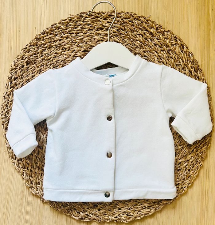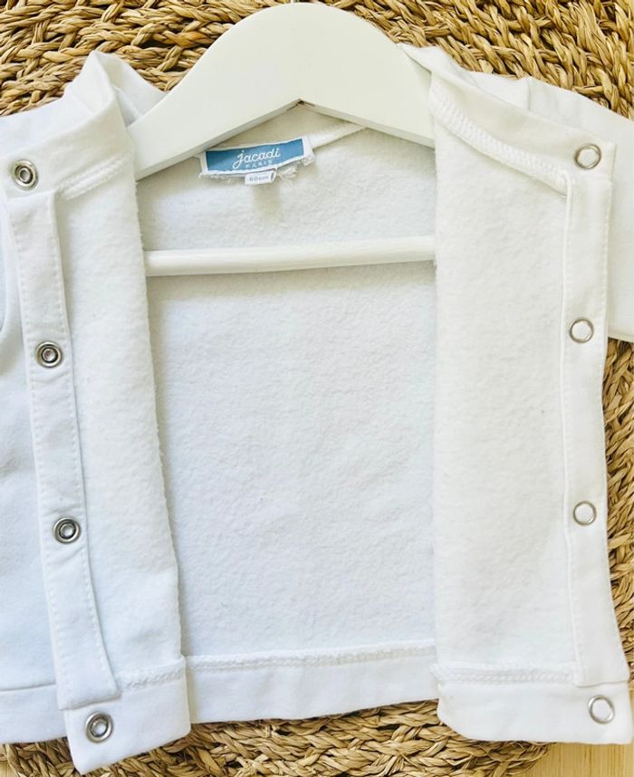 Cardigan molleton de la marque Jacadi en bon état. Gilet en molleton, modèle unisexe, fermeture par boutons pressions métallisés Jacadi à l’avant, coloris blanc, taille : 3mois/60cm. Valeur neuf : 29,00€ Envoi raide et soigné 📦