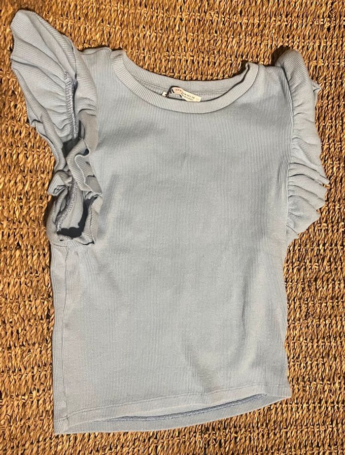 Tee-shirt sans manche bleu ciel côtelé, volants aux épaules. Zara, taille M. #oginifemme #zara #zarawoman