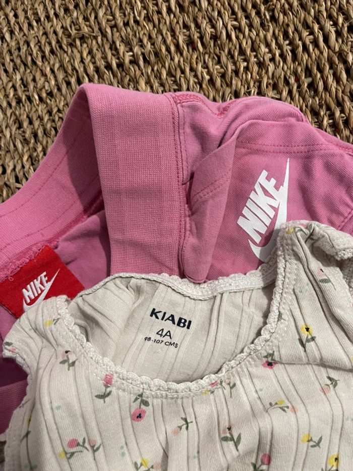 Lot composé de deux pièces pour fille taille 4/5 ans : 1 short Nike rose vif, confortable et léger, idéal pour l’été ou le sport 1 débardeur côtelé fleuri de chez Kiabi, à motifs floraux, coupe ajustée et matière stretch agréable à porter Tenue parfaite pour les journées ensoleillées. Les deux articles sont en très bon état, peu portés. #oginienfant #nike #shortnike #kiabi #kiabi #nikekids