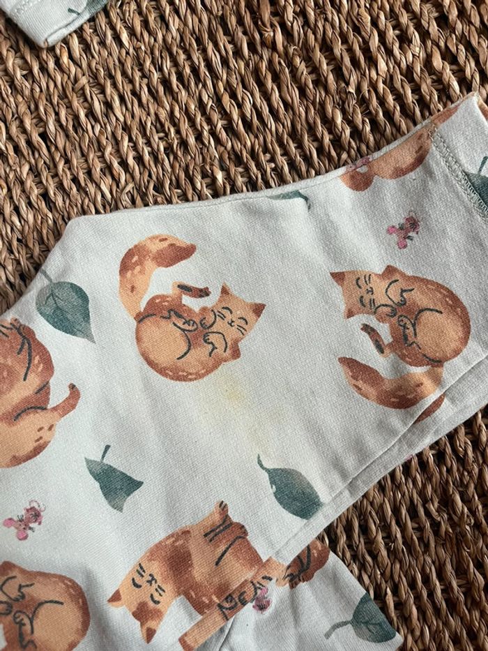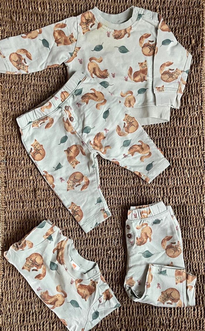 Lot de 2 ensembles en coton idéal jumelles/jumeaux/jumixtes : - Vert clair et motifs automnales marron - Haut manches longues - Bas taille élastique assortis - 6 mois (Légèrement taché) #oginienfant #twinset #twins #jumelles #lotjumelles #ensemblejumelles #hema #hemababy #oginitwins
