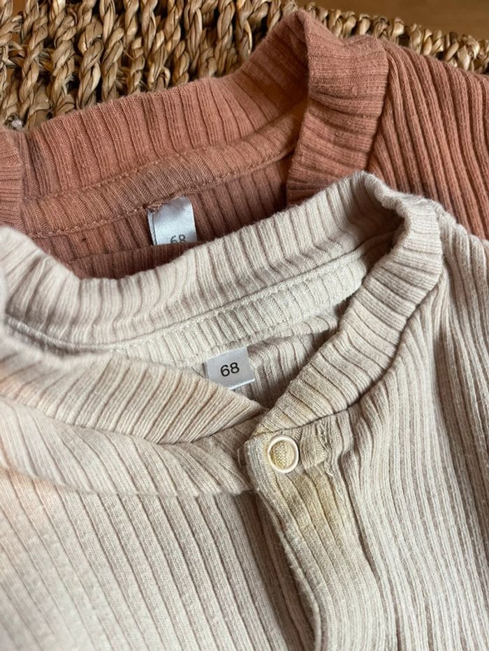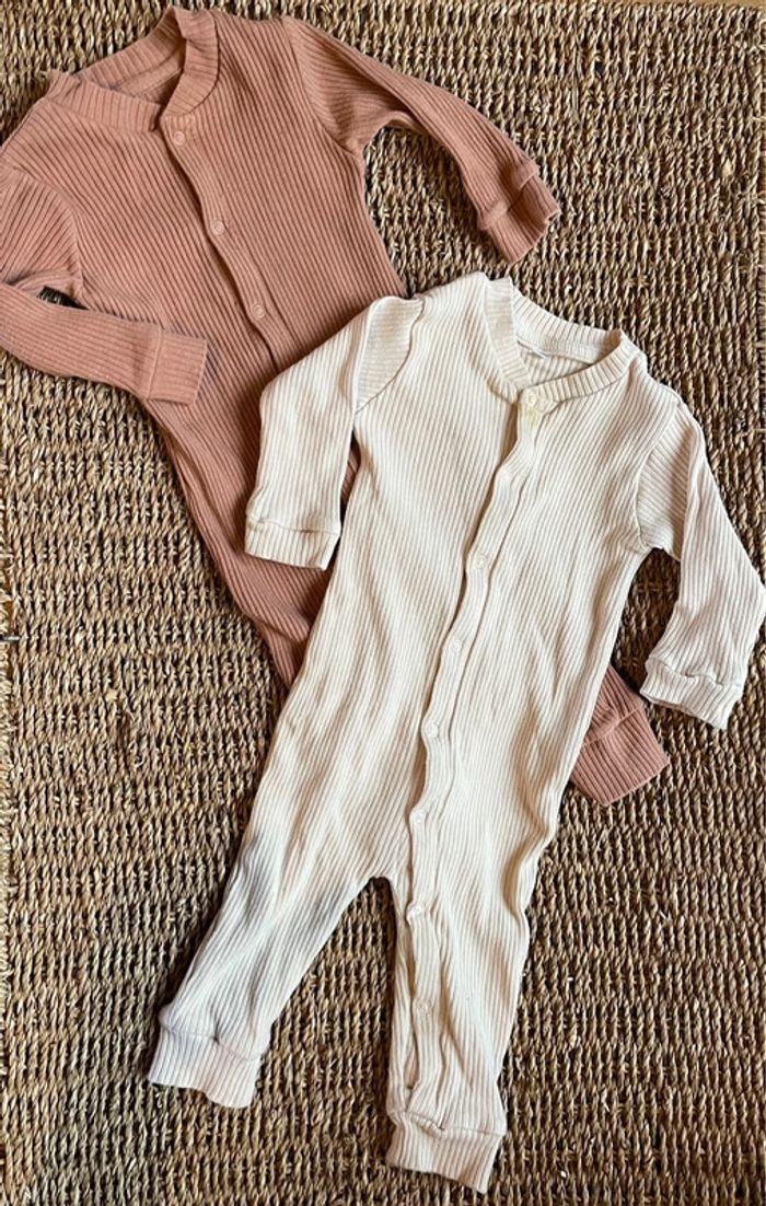 Lot de 2 ensembles côtelés en coton idéal jumelles : - Ouverture pression à l'avant - Manches longues - Sans pieds - Beige et Marron unis - 6 mois (Légèrement taché, voir photos) #oginienfant #twinset #twins #jumelles #lotjumelles #pyjamajumelles #zeeman #zeemanbaby #zeemanfille #oginitwins