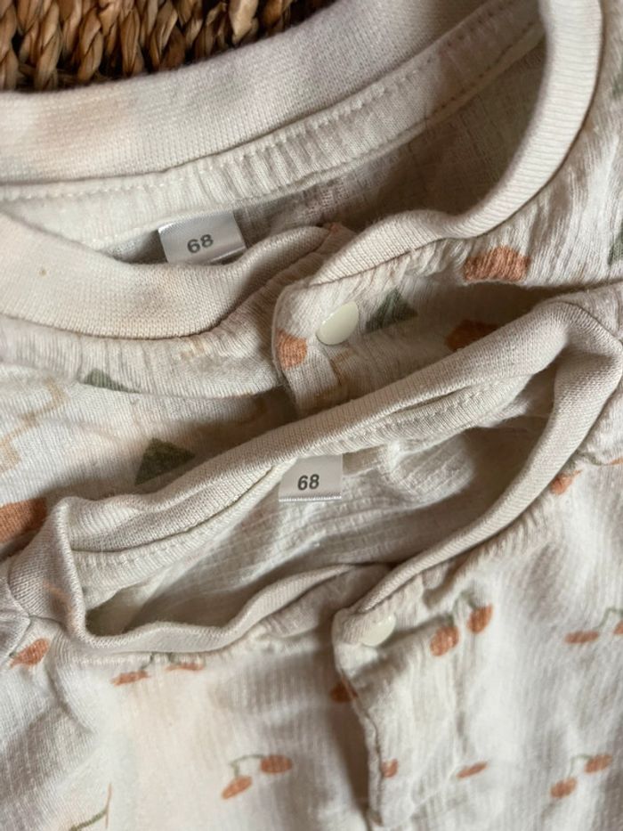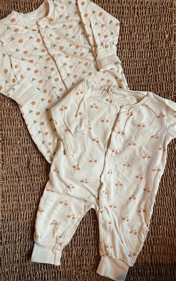 Lot de 2 ensembles en coton assortis idéal jumelles : - Croisé et pressions à l'avant - Manches longues - Sans pieds - Blanc avec motifs cerises et géométriques - 6 mois #oginienfant #twinset #twins #jumelles #lotjumelles #pyjamajumelles #zeeman #zeemanbaby #zeemanfille #oginitwins