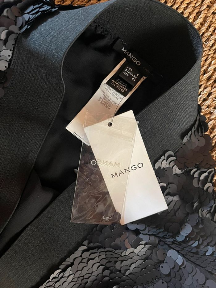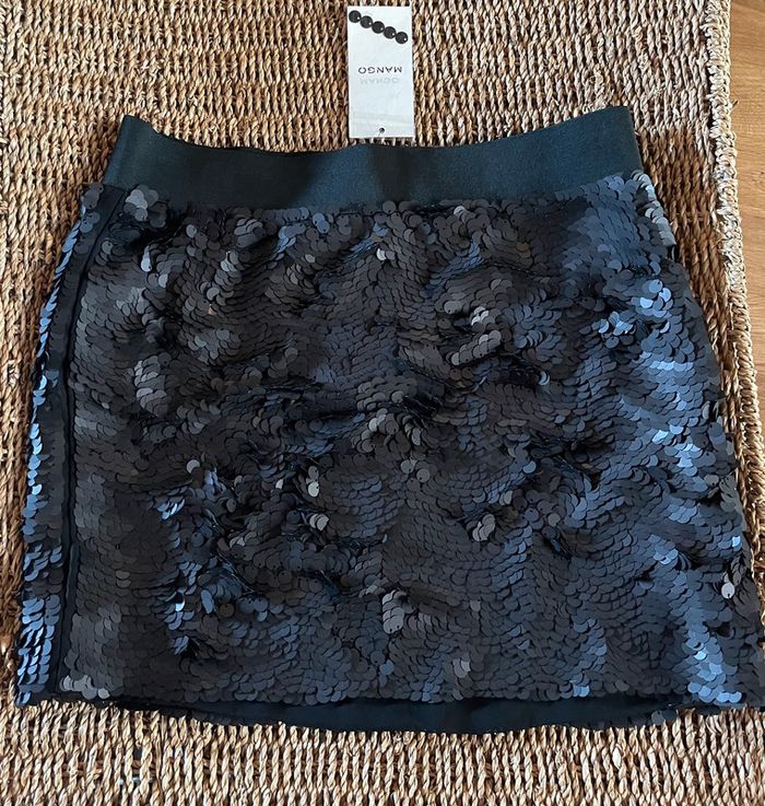 Mini jupe sequins noir mat all over, taille élastique, ouverture sur le côté avec fermeture éclair neuve avec étiquette. Mango - Taille S. #oginifemme #mango #mangowoman #mangofemme #mangoskirt #skirt #jupe #minijupe