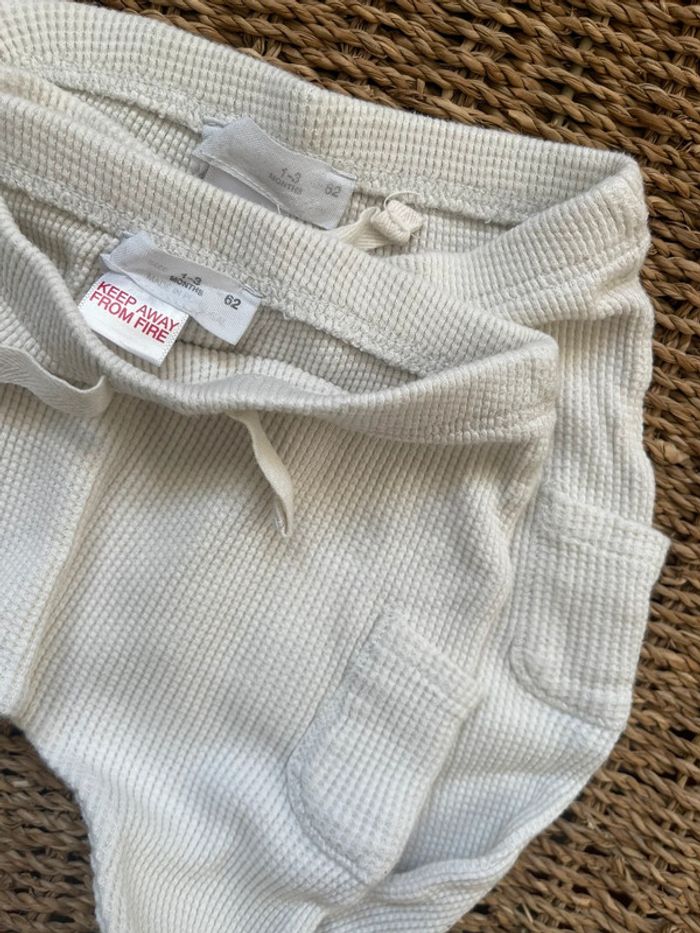 Lot de deux pantalons gaufrés blancs avec poche et avec pieds idéal jumeaux / jumelles / jumixtes. Zara - 1/3mois. #oginienfant #jumeaux #jumelles #jumixtes #zara #zarakids #zaramixte #oginitwins