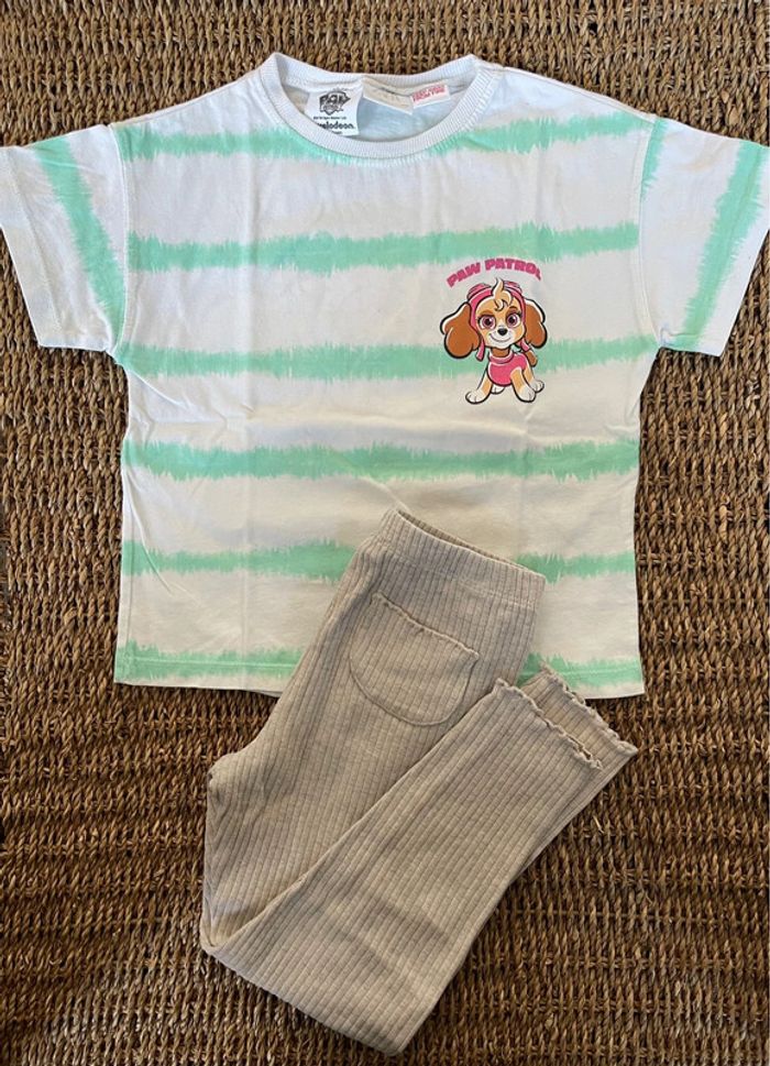 Ensemble comprenant 1 tee-shirt manches courtes tie n’ dye Stella de la Pat Patrouille Zara 2/3ans (taille grand) et un legging côtelé léger gris clair Mango 4/5 ans (taille petit). L’ensemble convient à une taille 3/4 ans. #oginienfant #patpatrouille #pawpatrol #stella #stellapatpatrouille #skye #skyepawpatrol #tiedye #zara #mango #zarakids #mangokids