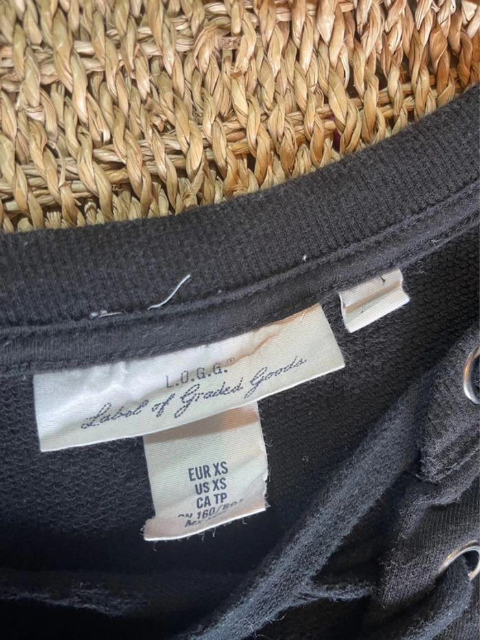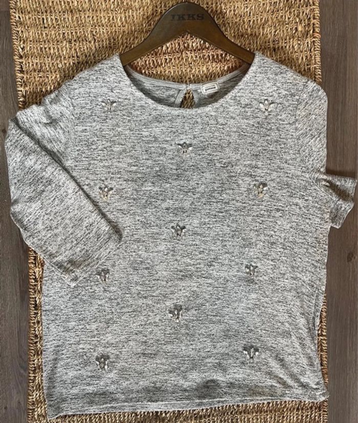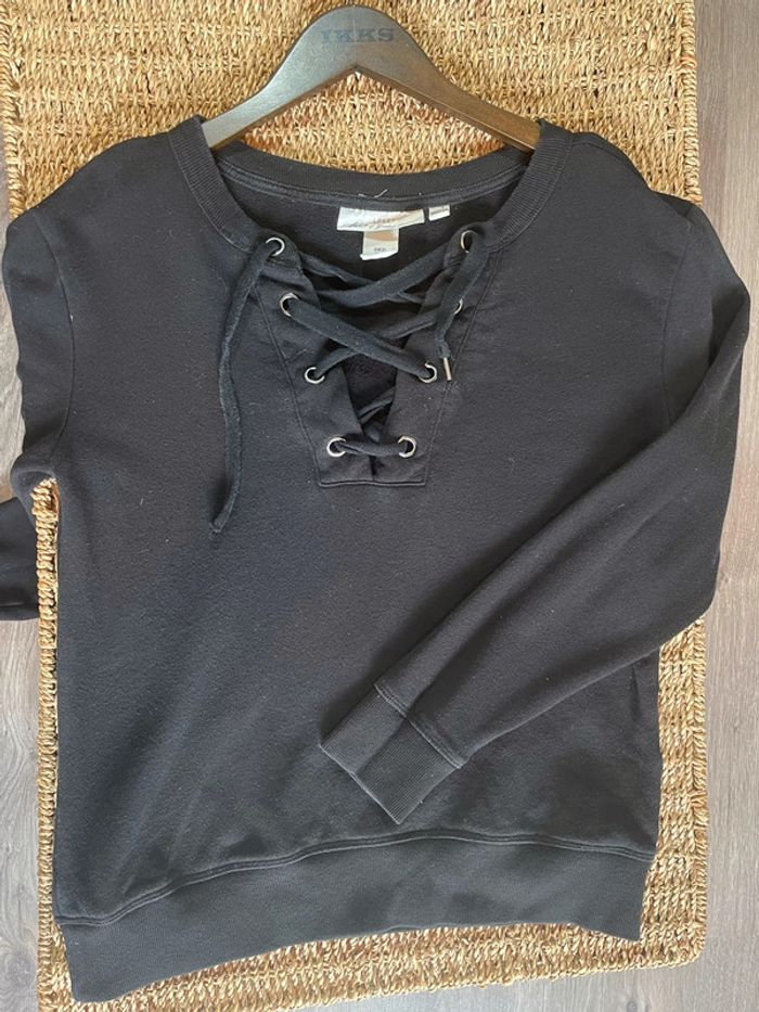 Sweat noir à lacet (il manque une partie en fer sur un des bouts…) - H&M, taille XS mais peux convenir à un S. Pull léger manches 3/4 gris chiné avec pierres serties et cousues - Pimkie, taille S. #oginifemme #hm #hetm #hmfemme #pimkie