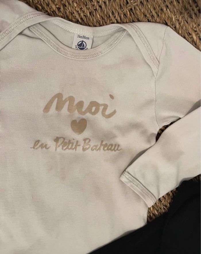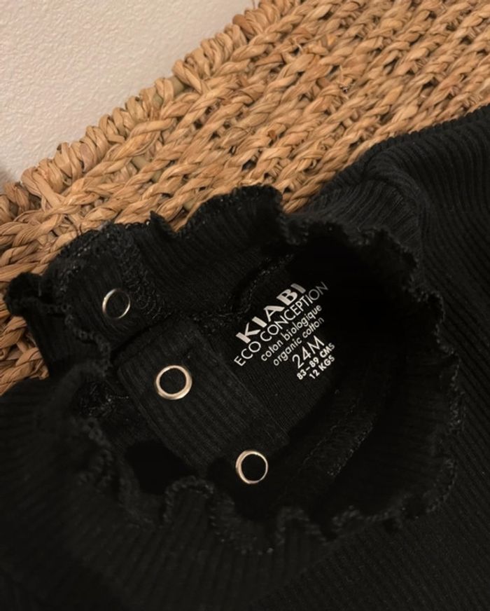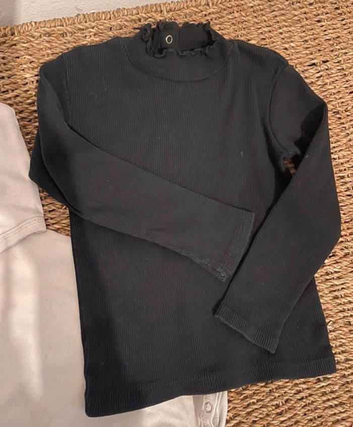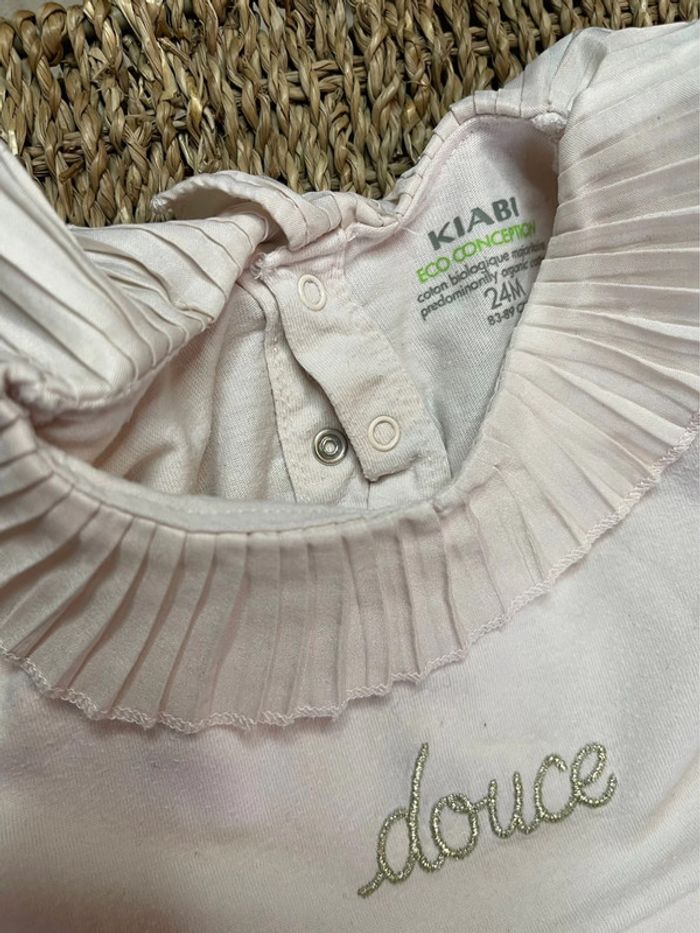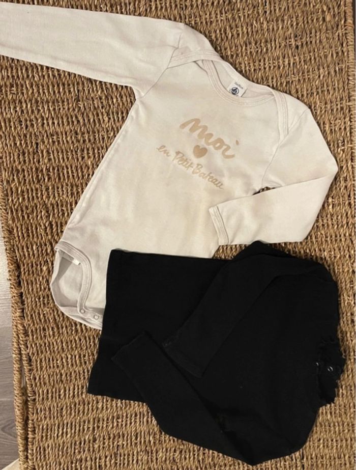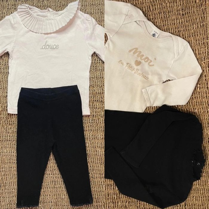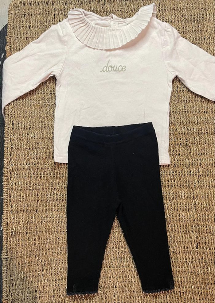 Ensemble comprenant 1 legging Zara 18/24 mois, noir finition dentelles et poches l’arrière et 1 haut manches longues rose pâle avec col en voile et broderie fil doré, Vertbaudet 24 mois. Ensemble comprenant un body Petit Bateau blanc (tâché) 24 mois + 1 haut noir côtelé à manches longues et col montant 24 mois - Kiabi. #oginienfant #kiabi #petitbateau #verbaudet #zara