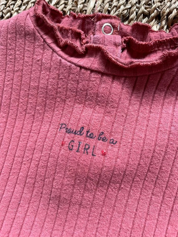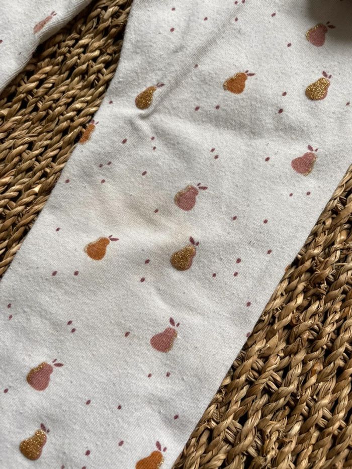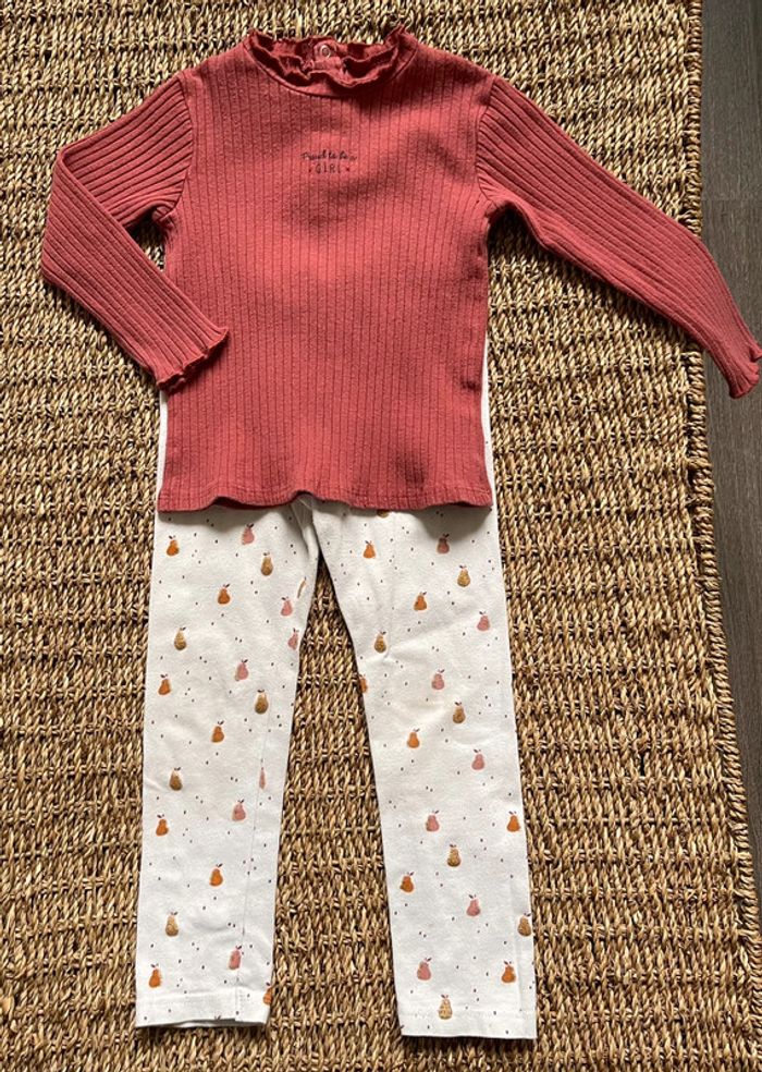 Ensemble comprenant deux pièces Kiabi : - 1 haut côtelé manches longues vieux rose avec inscription blanches, 24 mois (taille grand) - 1 legging crème motifs poires vieux rose et paillettes dorées, légèrement tâché au niveau d’un genou, 36 mois (taille petit) - 1 marinière à manches longues « Lulu Castagnette » il a des petites tâches, 3 ans. #oginienfant #kiabi #lulucastagnette