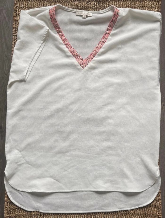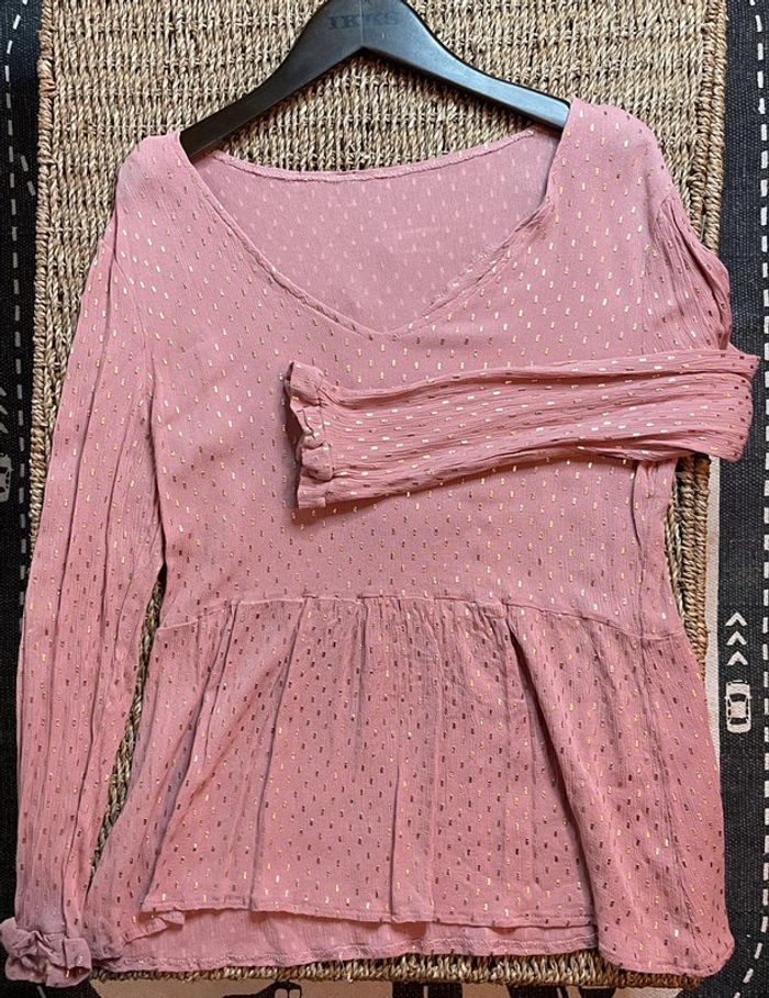 Blouse manche longues rose, strass rectangulaires dorés - Taille M. Blouse blanche avec envolure V brillante rose - Peace n' Love - TU. (Correspond à une taille M). #oginifemme