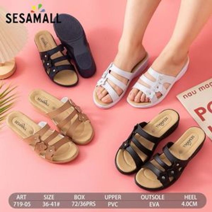 Mules à talon compensé avec multiples brides fines à fleurs QUANTITE 36 paires COULEURS MIXTES : Beige, Blanc, Bleu Marine, Noir POINTURES MIXTES : 36 - 37 - 38 - 39 - 40 - 41 HAUTEUR TALON 4 cm COMPOSITION PVC + EVA