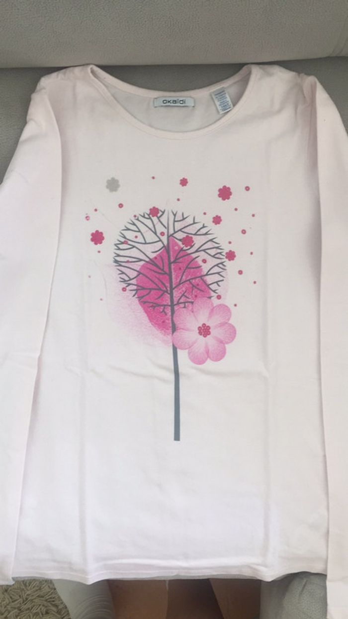 t shirt manches longues rose clair avec motif pour fille taille 14 ans marque : okaidi très bon état