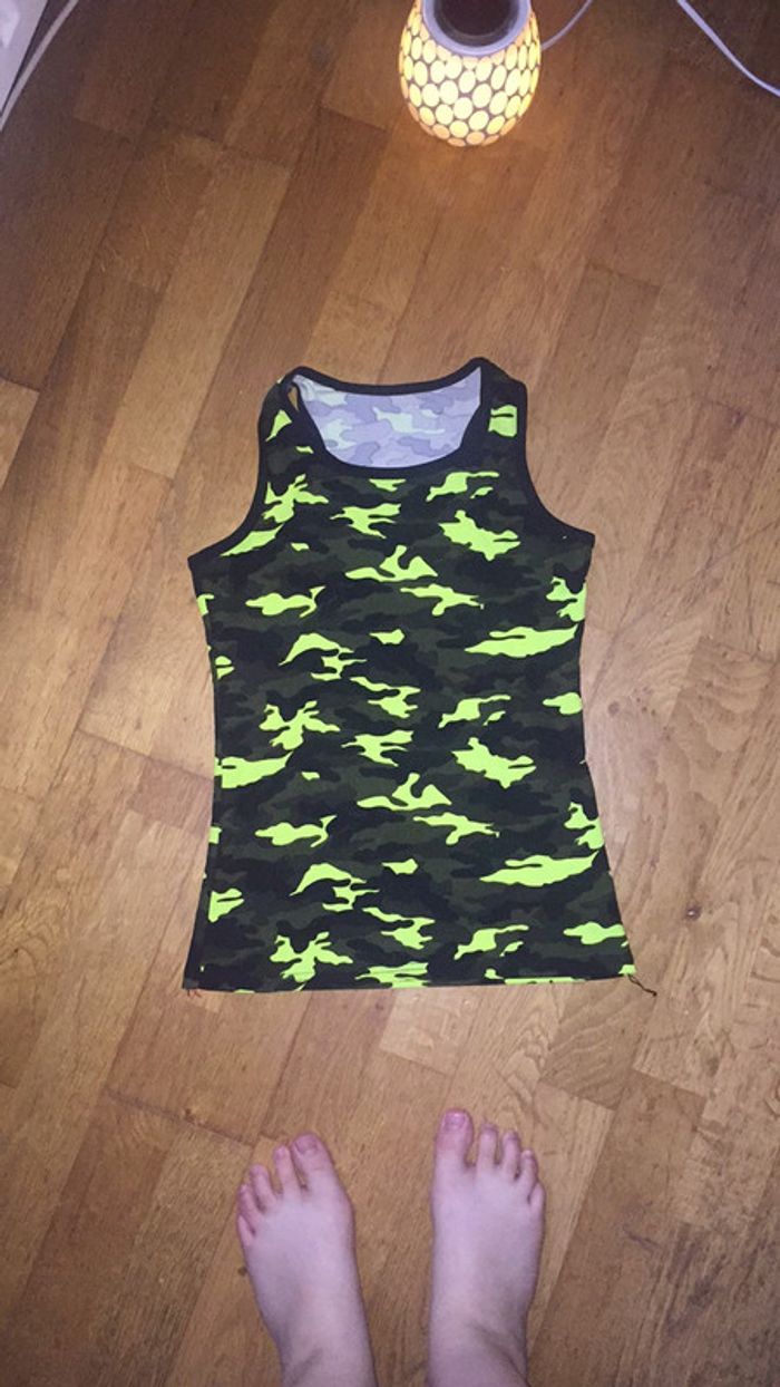 t shirt fille militaire taille S excellent état couleur : kaki, noir et jaune fluo matière : synthétique