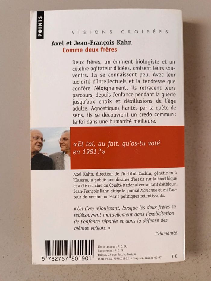 Axel et Jean-François Kahn Comme deux frères vision croisée. Voici le lien pour voir tous mes livres : #romain75015_Livres. Envoi rapide et soigné bien protégé pour le transport. N'hésitez pas à faire un lot pour avoir des réductions et mutualiser les frais de port.