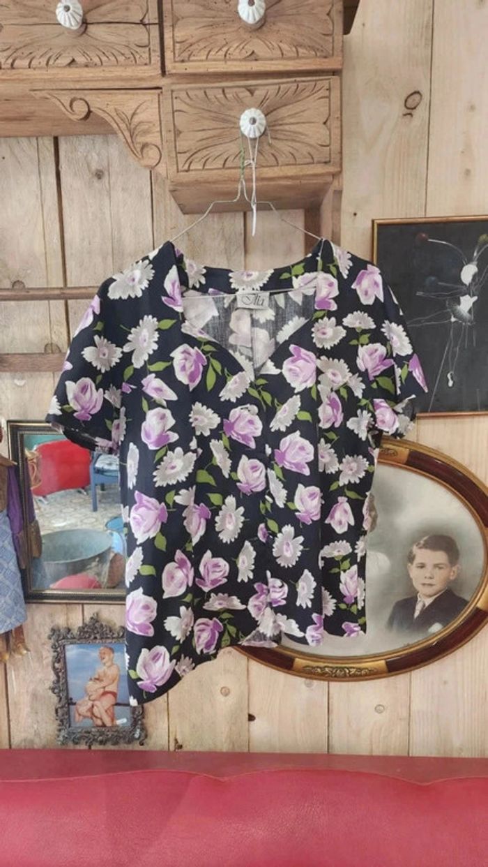 Adorable blouse vintage fleurie lilas et mauve en 100% coton - photo numéro 1